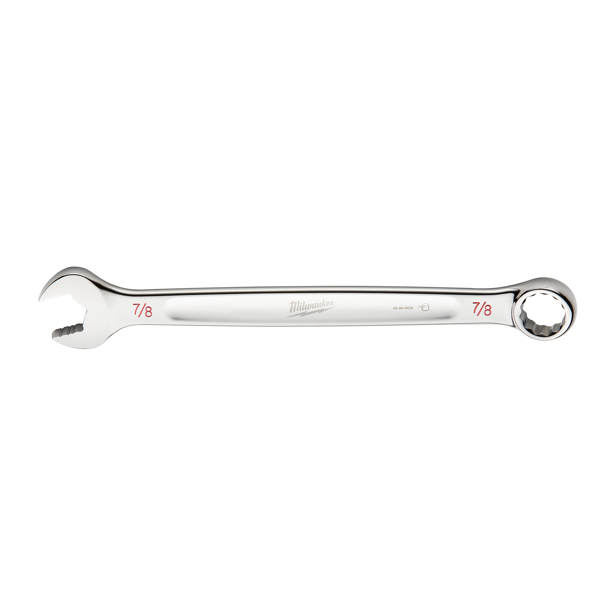 Our 7/8″ SAE Combination Wrenches provide you with 25% more torque than smooth-faced wrenches with our innovative MAXBITE™ Open-End Grip. In addition to increased torque, MAXBITE™ also reduces the rounding and stripping of nuts and bolts. Our ergonomic wrench features an I-Beam handle for optimized comfort and durability. Ink-filled size labels allow for easy size identification and quick distinction between SAE and metric sets. The MILWAUKEE® SAE wrench sizes range from 1/4″-1″ and feature a Lifetime Guarantee.