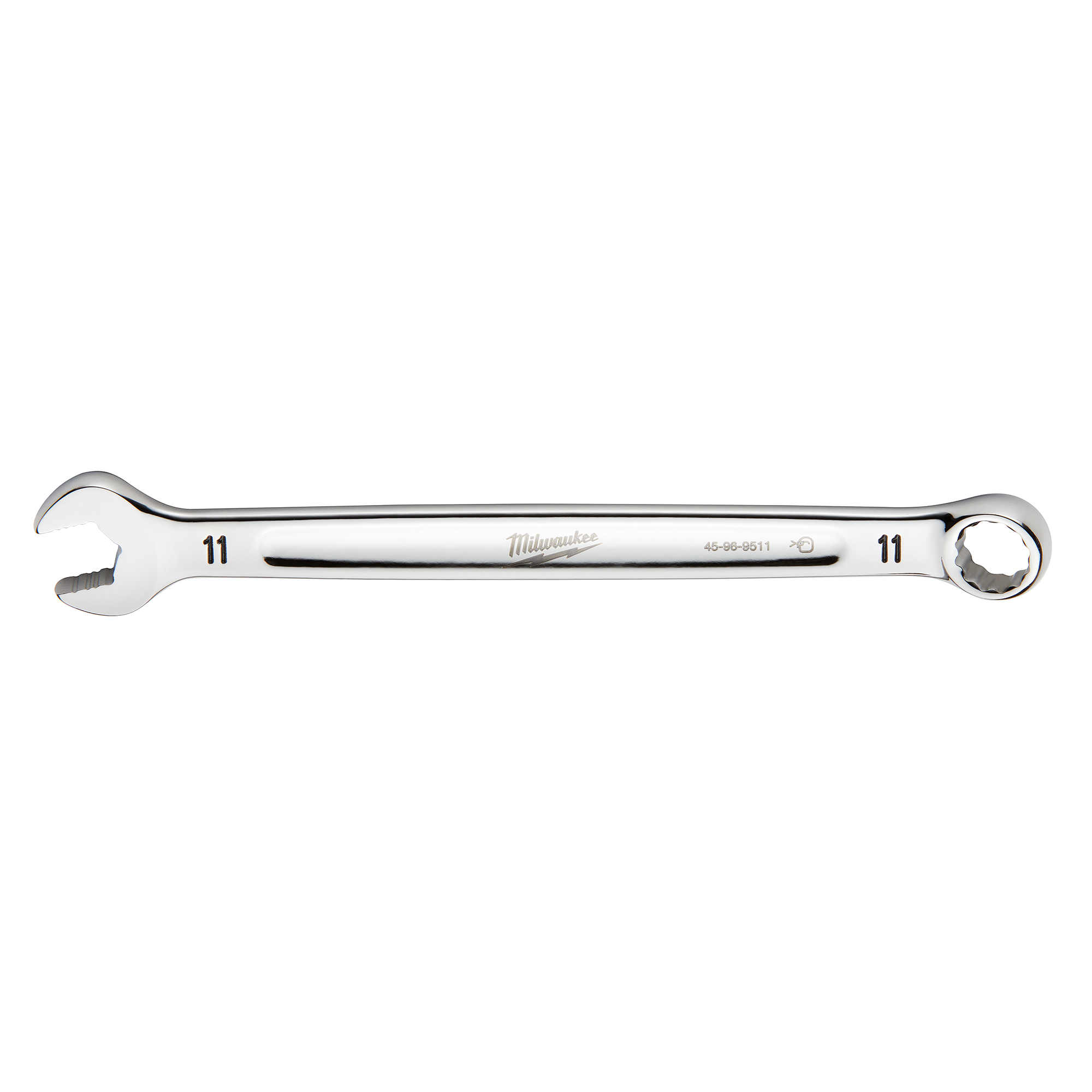 The MILWAUKEE® 11mm Metric Combination Wrench delivers 25% more torque than smooth-faced wrenches with MAXBITE™ Open-End Grip. MAXBITE™ also reduces the rounding and stripping of nuts and bolts. This open end wrench is optimized for comfort and durability with an ergonomic I-Beam handle. Ink-filled size labels allow for easy size identification and quick distinction between SAE and metric sets. The Milwaukee 11mm Metric Combination Wrench features a Lifetime Guarantee.
