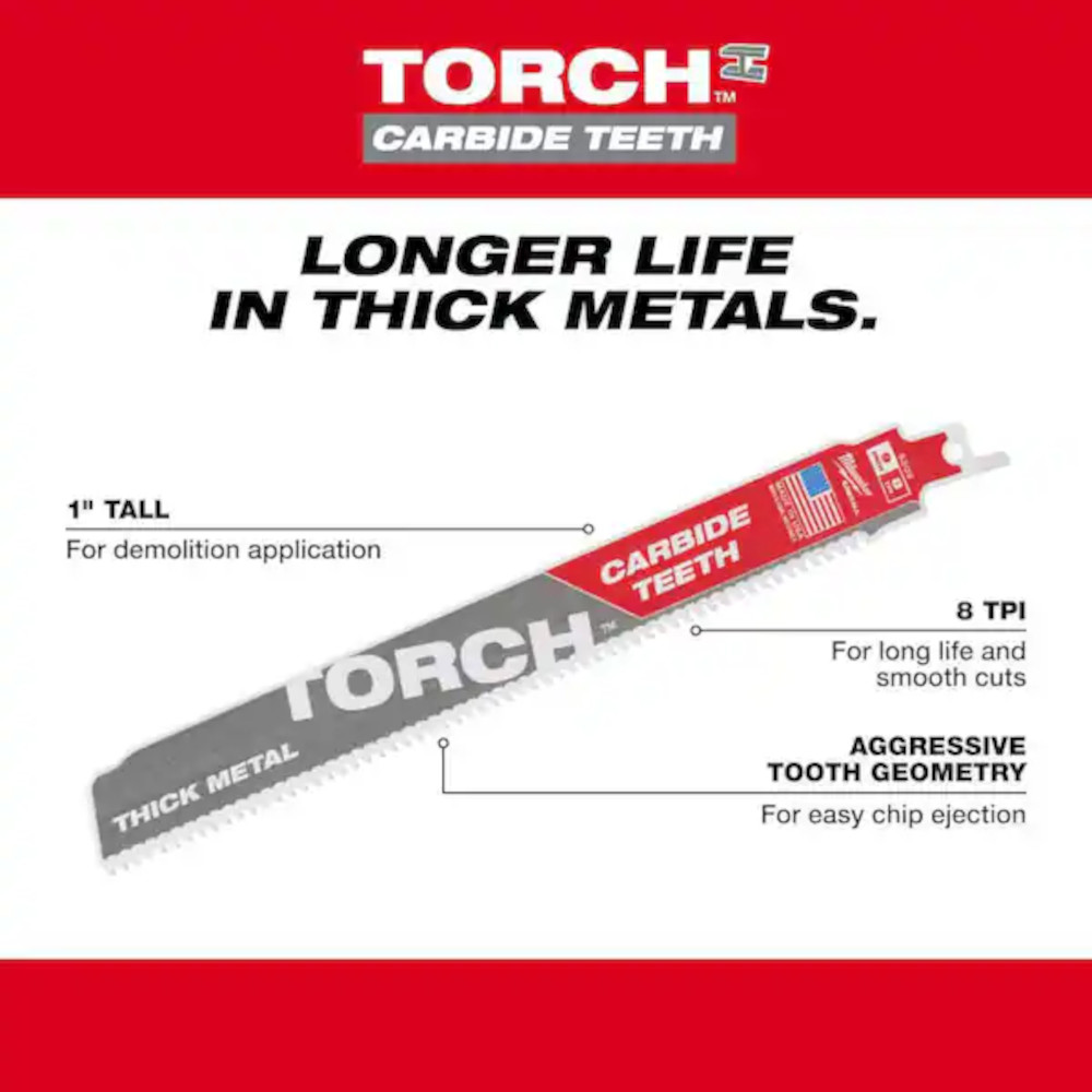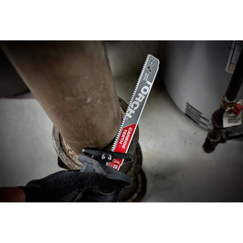 Our TORCH™ with Carbide Teeth SAWZALL® Blades have been engineered to deliver extreme life and unmatched versatility in thick and extreme metal cutting applications. This reciprocating saw blade delivers up to 50X life over standard blades. The TORCH™ with Carbide Teeth tackles a wide variety of metal materials ranging from black pipe and angle iron to cast iron, stainless steel, and high strength alloys. With up to 70% larger gullets than other carbide blades and an optimized tooth design, these blades deliver extreme life in metal cutting applications.