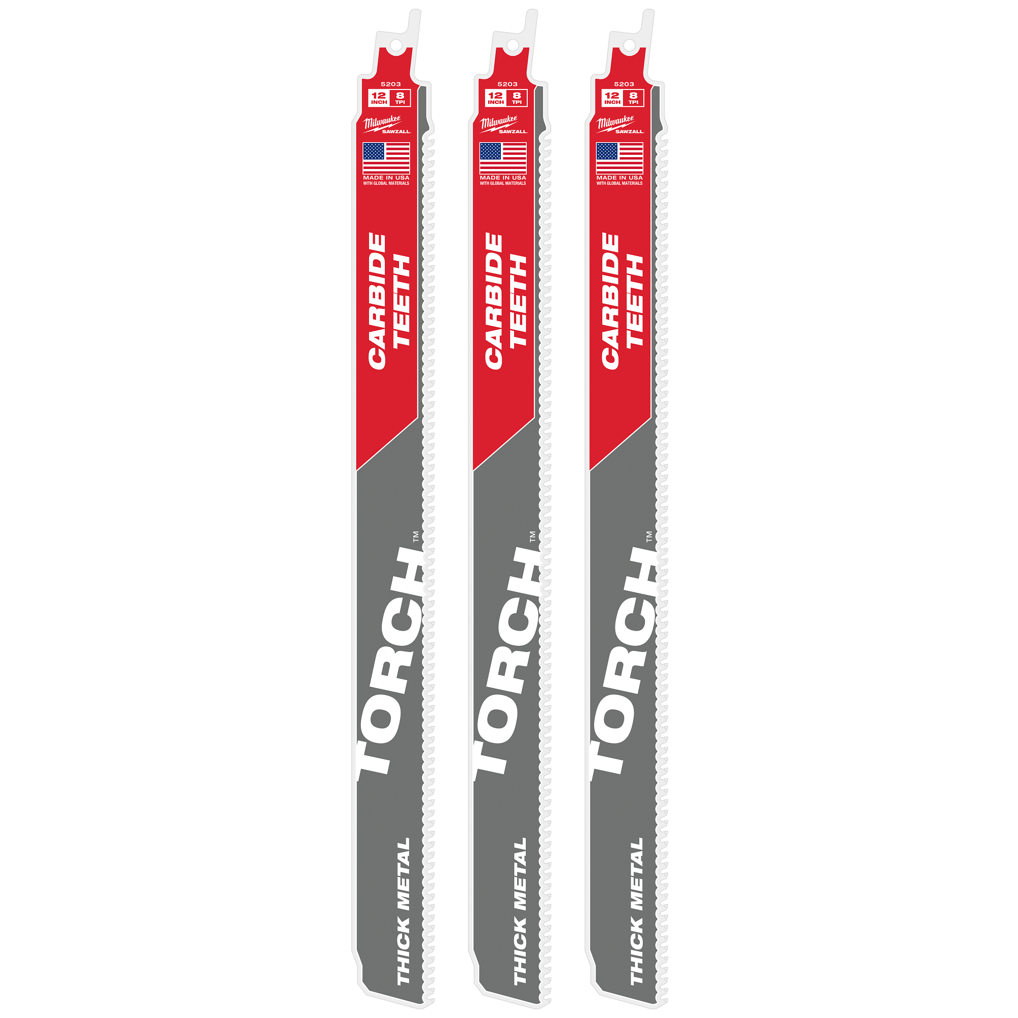 The MILWAUKEE® TORCH™ with Carbide Teeth SAWZALL® Blades have been engineered to deliver extreme life and unmatched versatility in thick and extreme metal cutting applications. This metal cutting SAWZALL® blade delivers up to 50X life over standard blades. The TORCH™ with Carbide Teeth tackles a wide variety of metal materials ranging from black pipe and angle iron to cast iron, stainless steel, and high-strength alloys. With up to 70% larger gullets than other carbide blades and an optimized tooth design, these blades deliver extreme life in metal cutting applications.