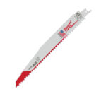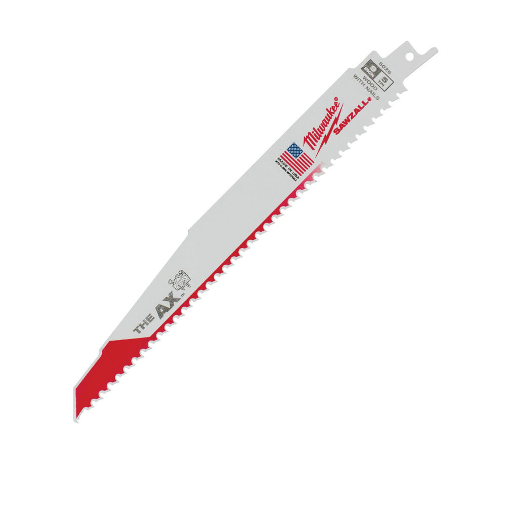 The Ax blade is designed for the toughest cutting applications in wood and nail embedded wood. Ax blades have a sloped shape for superior plunge cutting for demolition and remodeling work. Ax blades are 1″ tall for straight, fast cutting, and extra thick, 0.062 in., to prevent bending. Milwaukee SAWZALL blades have a unique heat treating process that extends the life of the blades, and bi-metal construction prevents the blade from shattering. The 9 in. blade is ideal for cutting into walls that contain wood, nails, plaster and aluminum.