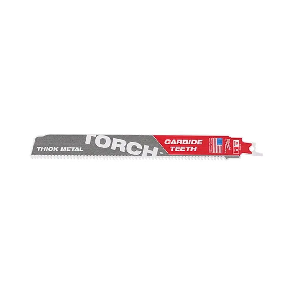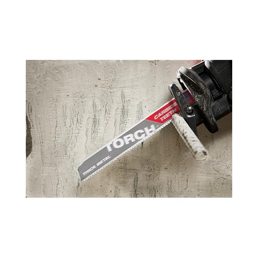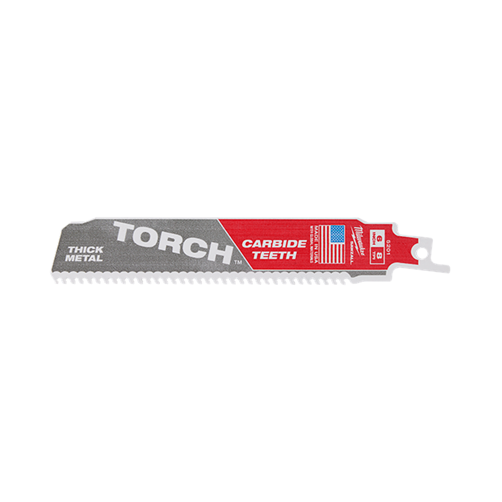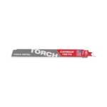 Our 9″ TORCH™ with Carbide Teeth SAWZALL® Blades have been engineered to deliver extreme life and unmatched versatility in thick and extreme metal cutting applications. This reciprocating saw blade delivers up to 50X life over standard blades. The TORCH™ with Carbide Teeth tackles a wide variety of metal materials ranging from black pipe and angle iron to cast iron, stainless steel, and high strength alloys. With up to 70% larger gullets than other carbide blades and an optimized tooth design, these blades deliver extreme life in metal cutting applications.