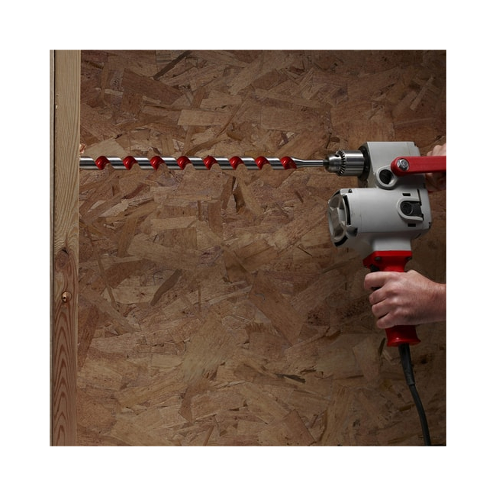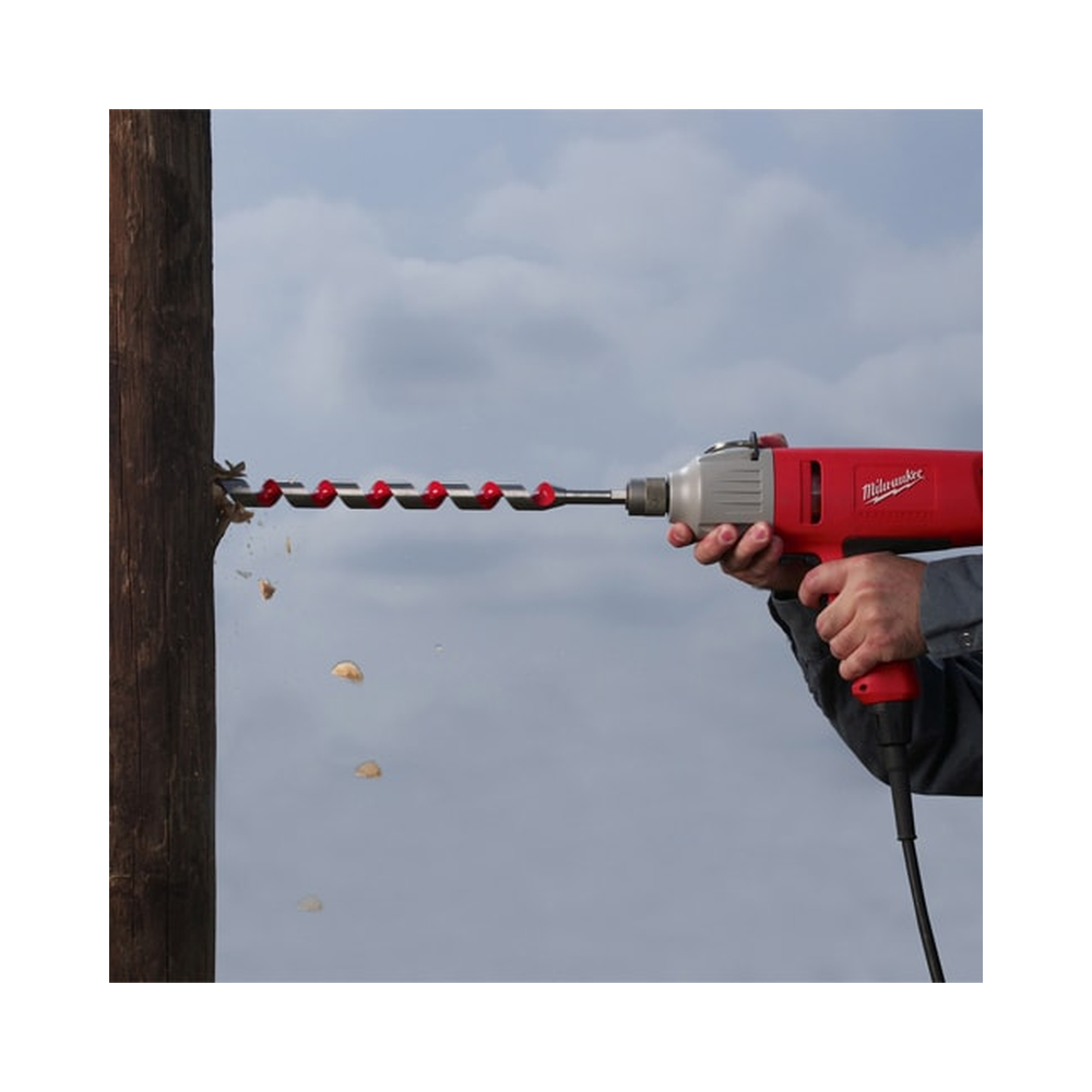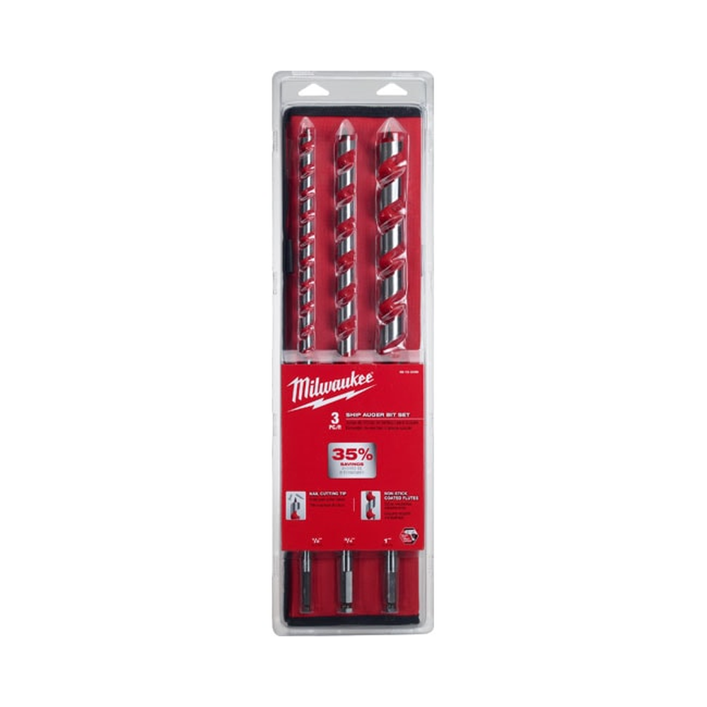 The Milwaukee® 3-Piece 18″ Ship Auger Bit Set drills through up to 2X the nails of competitive auger bits without needing resharpening. Drill into clean or nail-embedded wood with confidence when installing Romex wire, Pex water lines, rebar, bolts, and rope in piers, playground equipment and landscaping. The flutes are wider for maximum chip removal, even in deep holes. The polished and coated flute finish means chips won’t stick to the bit, even when drilling in material that contains sap or glue.The through-center cutting design creates a more solid striking point against nails compared to the competitions’ ahead-of-center and behind-center designs. The longer shaft length makes it easy to drill deeper or overhead without an extension. The set includes 1/2″, 3/4″ and 1″ ship auger bits in a roll-up pouch with room for extra bits. Includes:
