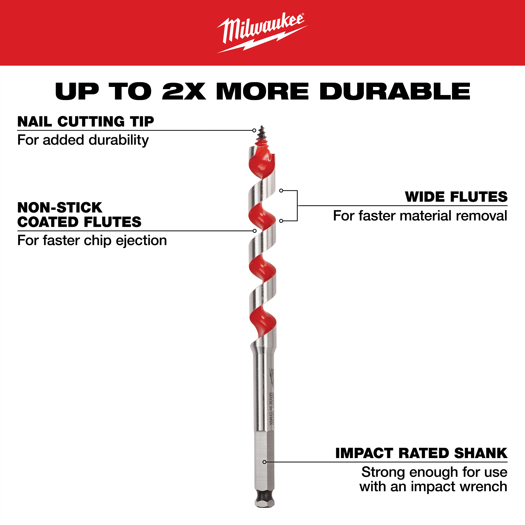 Milwaukee® auger bits are designed for electricians, plumbers, utilities and any trade requiring fast, clean holes in wood. The double wing spurs continually scribe the hole producing smooth holes without breakout. The flutes are coated, which produces a non-stick surface for fast and smooth chip ejection. The shanks are also impact rated for added durability and versatility no matter the trade.