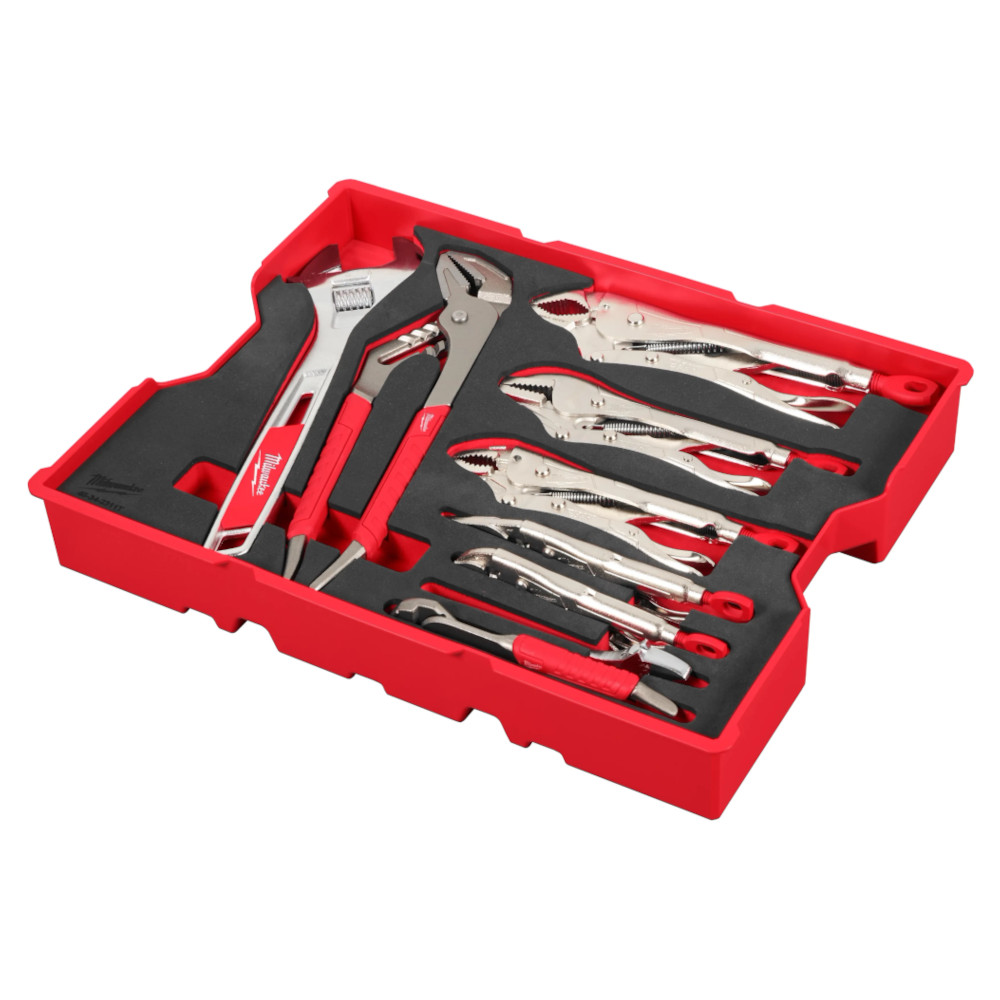 Our 9pc Pliers & Wrench Set features TORQUE LOCK™ Pliers with faster setup and more locking force. The unique thumb screw provides better geometry for hand force and provides clearance to generate more torque. The included adjustable wrenches have jaws that won’t back off due to the design of the proprietary adjustment screw. The comfort-grip straight jaw pliers incorporate exposed metal handles and a precision ground pliers head, allowing you to ream pipe and punch electrical knockouts easily. The durable reinforced tray features high-contrast EVA foam and easy-to-read size labeling for quick tool identification. The trays are designed for use in PACKOUT™ Drawer Tool Boxes (48-22-8444, 48-22-8442, 48-22-8447). The pliers and adjustable wrenches are all backed by our Milwaukee® Limited Lifetime Warranty.
