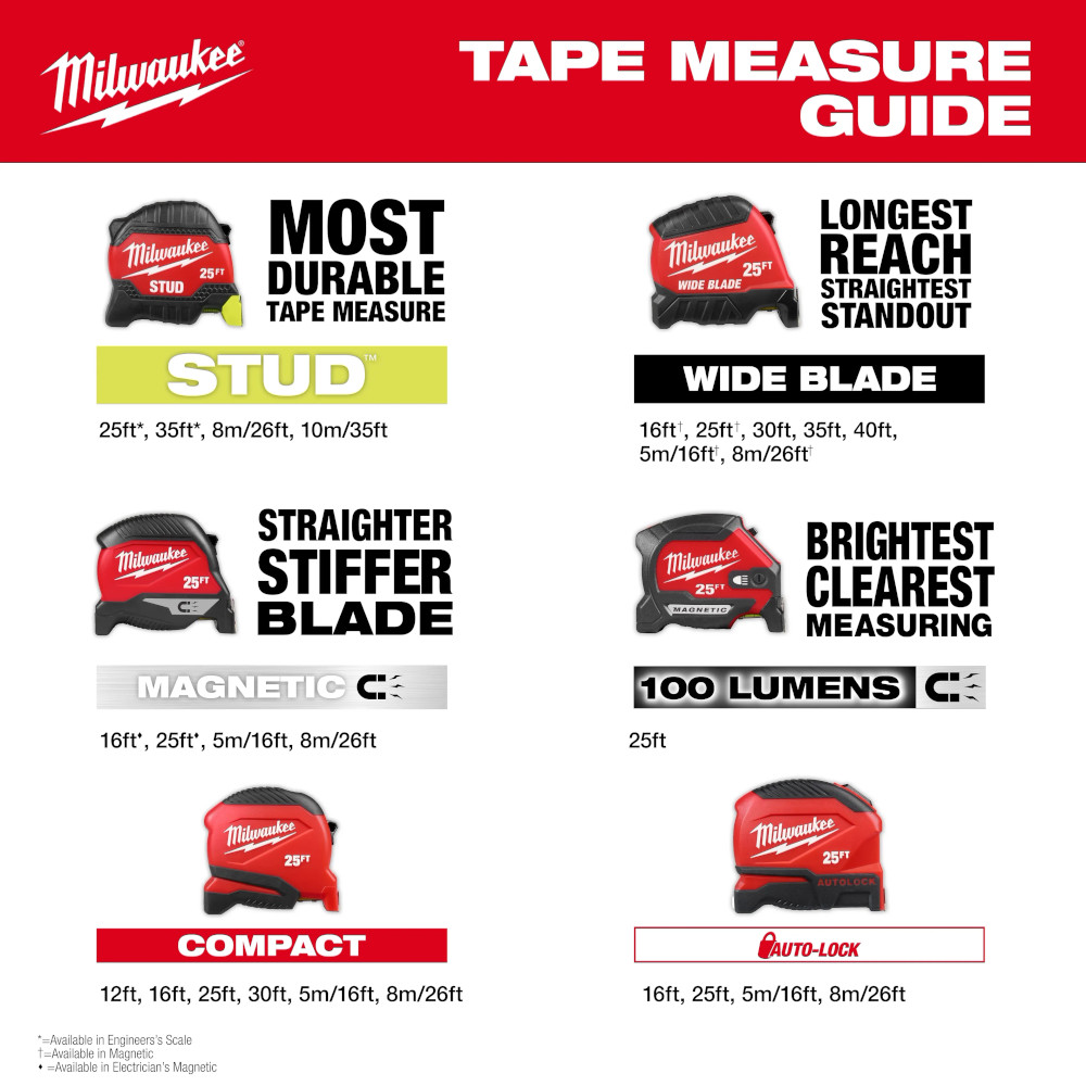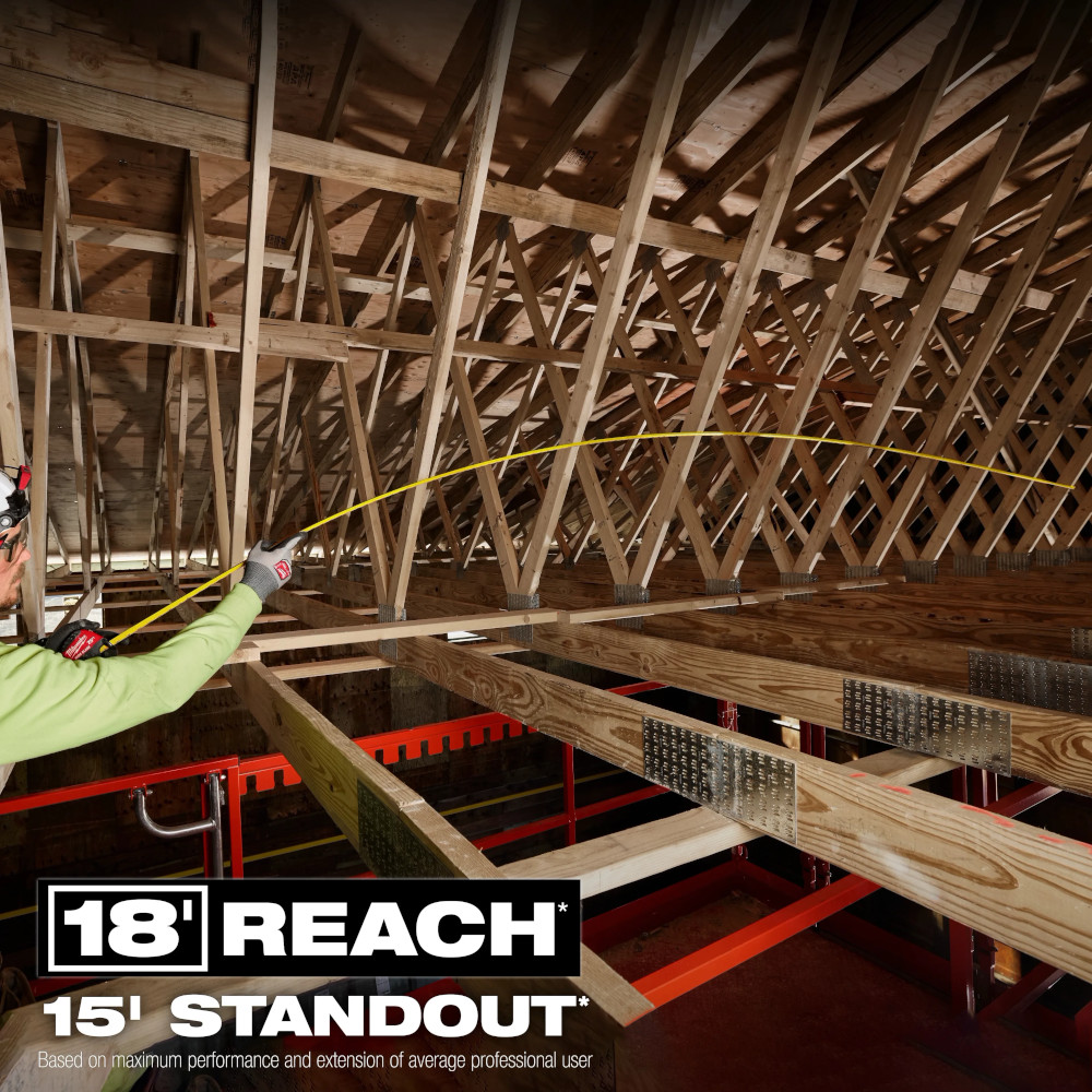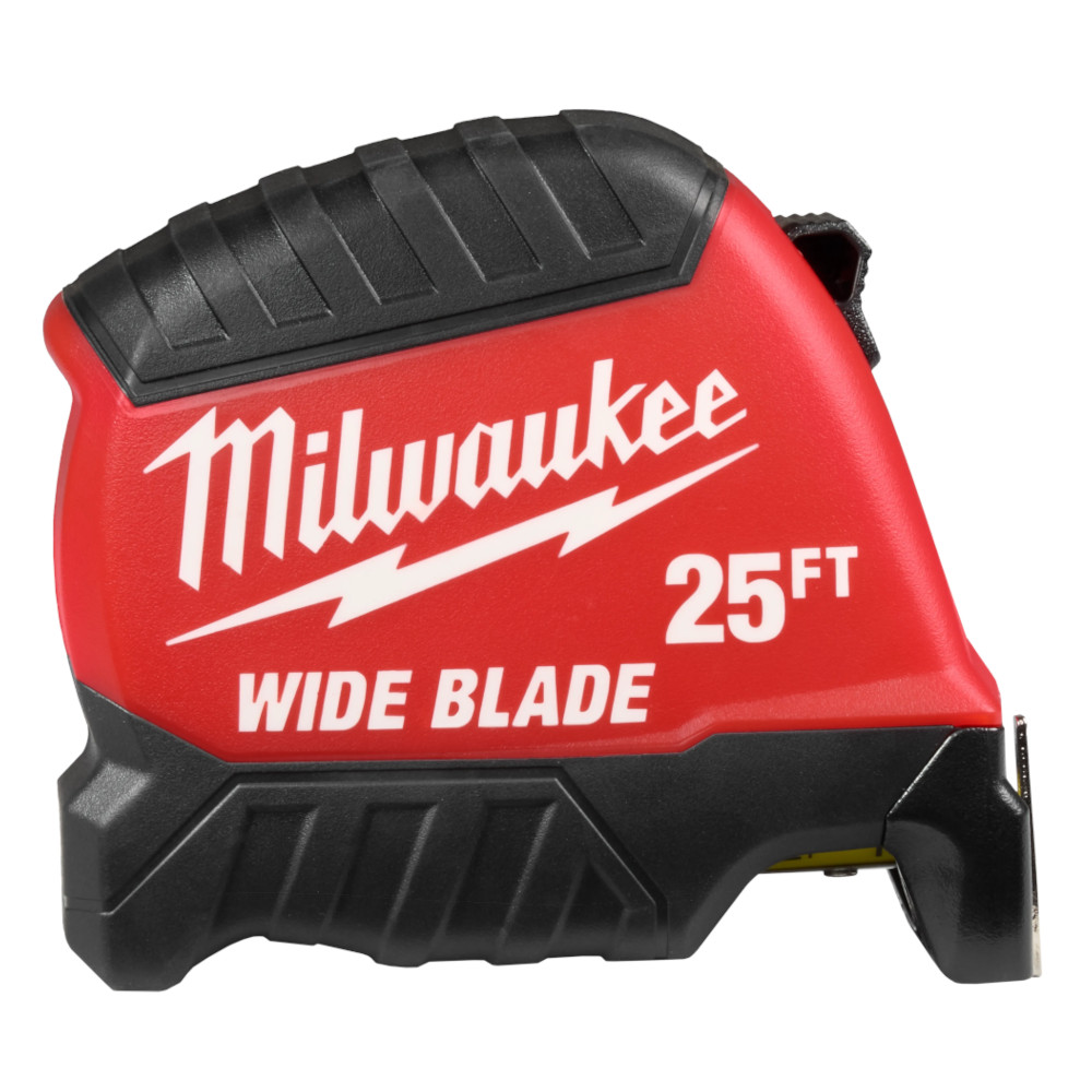 Our 25ft Wide Blade Tape Measure delivers the longest reach and straightest standout in the industry. 18’ of Reach and 15’ of Standout allow you to take long measurements on your own and reach further on the jobsite. The Wide Blade Tape Measure features a finger stop for quick, controlled blade retraction and double-sided anti-tear coating that reinforces the first 6” of the blade. This tape measure is equipped with a large hook for improved top and bottom hook grab onto common jobsite materials and double-sided printing for measuring in different orientations. Built to withstand the jobsite, this tape has a fully reinforced impact resistant body and a wire form belt clip to reduce pocket tearing.