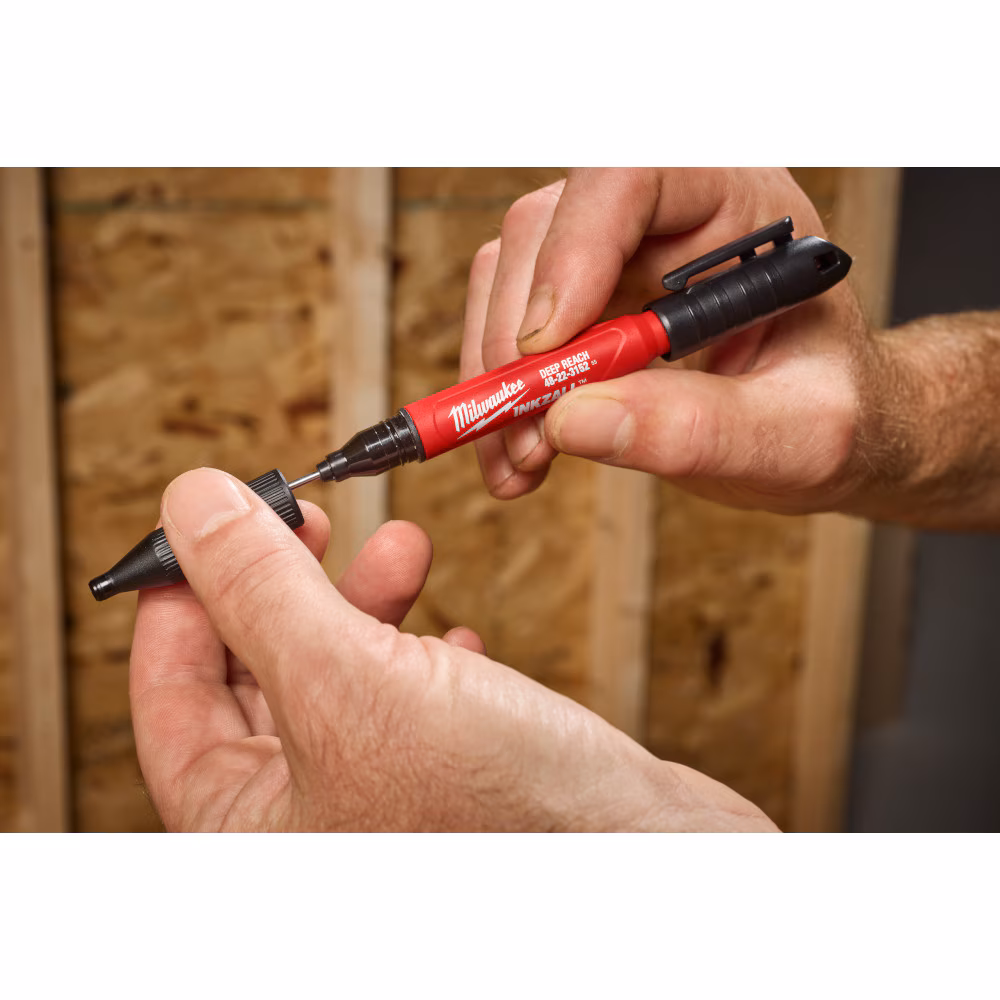 Our INKZALL™ 2IN1 Deep Reach Ultra Fine Point Jobsite Marker is designed with an adjustable length tip to provide better access and longer life. The durable marker tip can withstand writing on rough surfaces and writes through dusty, wet, or oily contamination. For added user convenience, the 2IN1 INKZALL™ marker is built to resharpen and features a hard hat/helmet clip for easy storage and access. INKZALL™ markers confirm Milwaukee’s commitment to best-in-class durability and their relentless mission to provide innovative solutions to the end user.