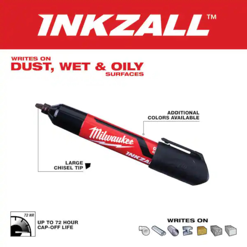 Our INKZALL™ Black Large Chisel Tip Jobsite Markers are optimized for job site conditions. The large chisel tip allows you to write bigger and bolder for clear visibility. The construction marker features a durable tip that is designed to write on dusty, wet or oily surfaces. It is clog resistant, providing you with clean, continuous marking. Quick Dry ink also reduces the likelihood of smearing after use. The permanent marker can be left without a cap on for up to 72 hours and remain completely functional. Our MILWAUKEE® INKZALL™ markers showcase our relentless mission to provide you with innovative solutions and commitment to best-in-class durability.