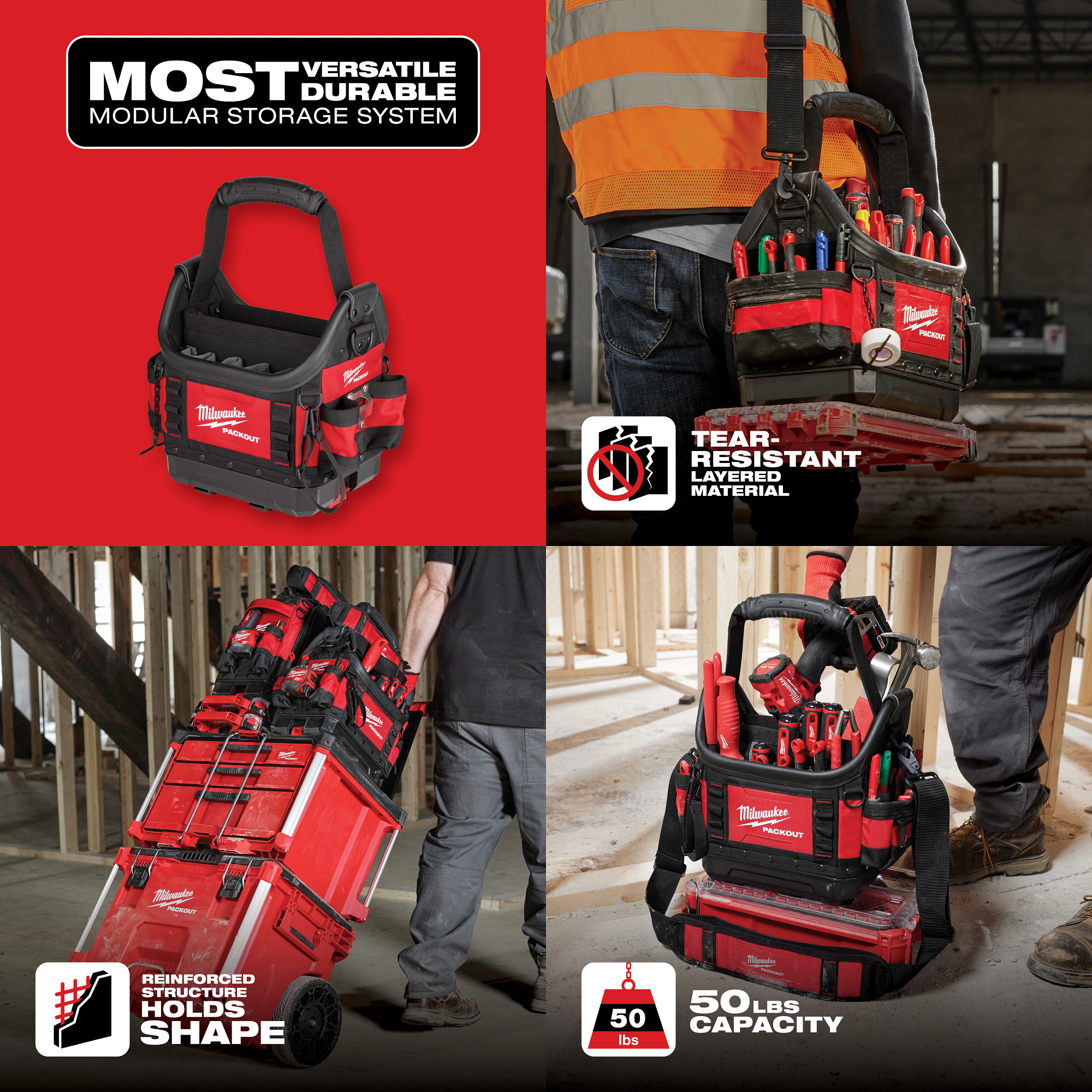 The MILWAUKEE® PACKOUT™ Modular Storage System is the industry ‘s most durable and versatile storage system. The PACKOUT™ 10” Structured Tote features tear resistant layered ballistic material, a reinforced structure that holds its shape over time, and has a carrying capacity of up to 50 pounds. The impact-resistant molded base connects with other MILWAUKEE® PACKOUT™ system components via integrated locking cleats. The 10″ Structured Tote has all metal hardware, YKK zippers, and 35 pockets. The padded shoulder strap quickly and conveniently stores on the handle for maximum organization. The PACKOUT™ Modular Storage System allows users to customize and build their tool storage to suit their needs.