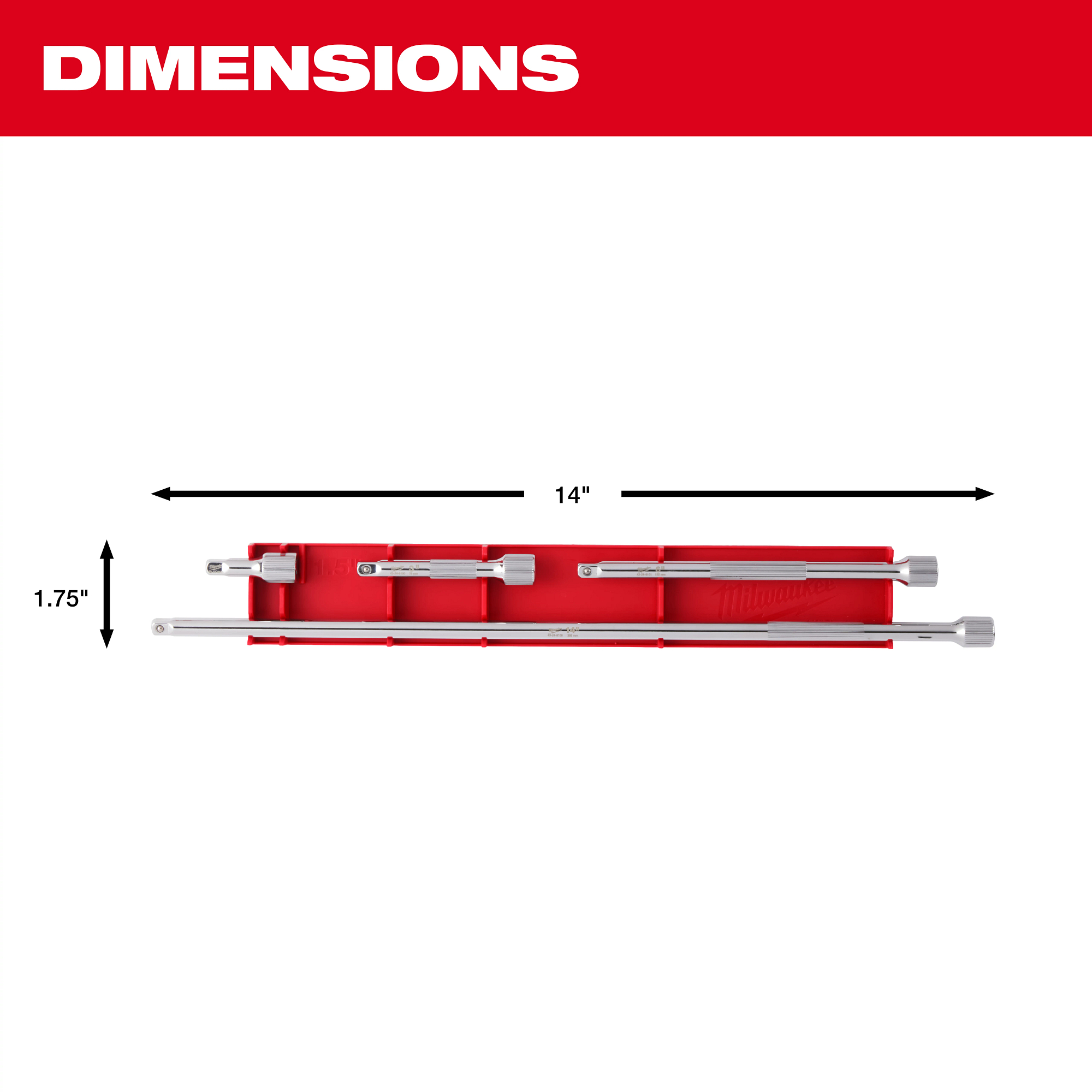 The extensions in this 4 piece set feature the largest knurling surface, offering the most control. Each extension has knurling on the female drive end to help when hand-tightening fasteners or working with oily materials. Additionally, select extensions in the set have knurling on the shaft for more control. The set includes a durable compact storage rack designed to optimize drawer space for long-term use. Chrome plating offers corrosion and rust protection. All Milwaukee® Mechanics Hand Tools are backed by a lifetime guarantee.