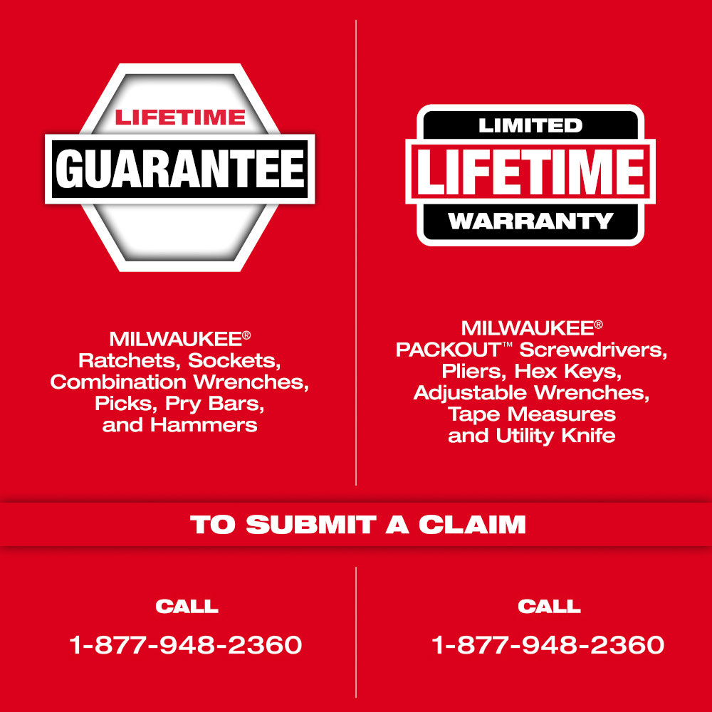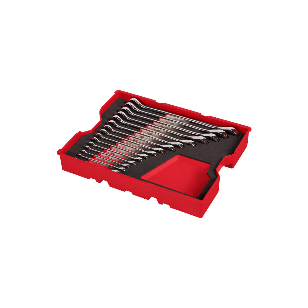 The MILWAUKEE® 60pc Metric & SAE Combination Wrench Set w/ PACKOUT™ 4-Drawer Tool Box features ratcheting wrenches with 2.5° of arc swing and 144 ratcheting positions for better access in tight spaces. The durable double-stacked pawls in the ratcheting mechanism offer the longest ratchet life and improved access. The MAX BITE™ Open-End Grip improves the wrench’s grip on nuts and bolts, delivering up to 25% more torque than competitor wrench designs. The I-Beam handle design provides comfort in high-travelor applications and features easy-to-read ink-filled size labeling. The PACKOUT™ 4-Drawer Toolbox is part of the most versatile and durable modular storage system and comes equipped with a locking security bar that can be secured with a padlock. The durable reinforced trays feature high-contrast EVA foam and easy-to-read size labeling for quick tool identification. All Mechanics Hand Tools are backed by the Milwaukee® Lifetime Guarantee. The Milwaukee® Limited Lifetime Warranty covers the PACKOUT™ toolbox.