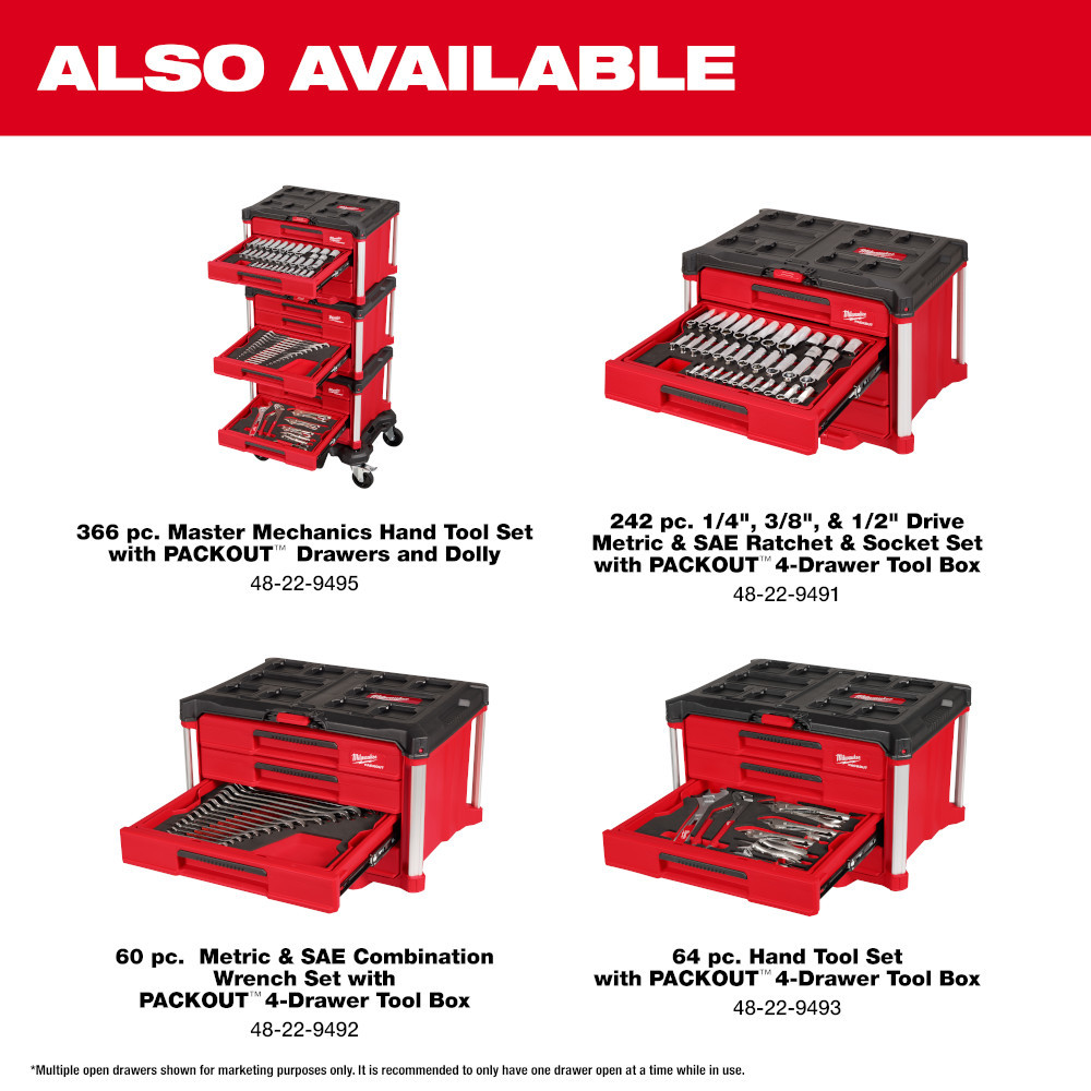 The MILWAUKEE® 366pc Master Mechanics Hand Tool Set w/ PACKOUT™ 4-Drawer Tool Box provides users with a wide range of innovative hand tools and accessories. The 6-point chrome sockets have FOUR FLAT™ Sides that deter rolling and are wrench compatible, and the 90-tooth ratchets provide 4° of arc swing for work in tight spaces. The ratcheting combination wrenches have 2.5° of arc swing for better access in tight spaces and MAX BITE™ Open-End Grip, delivering up to 25% more torque. The SHOCKWAVE Impact Duty™ sockets feature the boldest, longest-lasting markings and extreme impact durability in high torque applications. This set also includes a mix of pliers, picks, pry bars, screwdrivers, hammers, and more for various applications. The PACKOUT™ 4-Drawer Tool boxes and Dolly are part of the most versatile and durable modular storage system. The toolboxes have a locking security bar that can be secured with a padlock. The durable reinforced trays feature high contrast EVA foam and easy-to-read size labeling for quick tool identification. Ratchets, sockets, combination wrenches, picks, pry bars, and hammers are backed by the Milwaukee® Lifetime Guarantee. The PACKOUT™ toolbox, screwdrivers, pliers, hex keys, adjustable wrenches, tape measure, and utility knife includes our Milwaukee® Limited Lifetime Warranty.