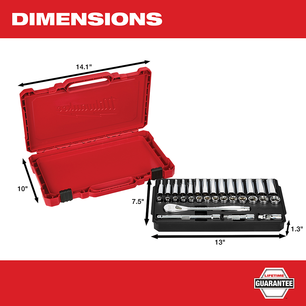 The MILWAUKEE SAE 32 piece 3/8″ drive Ratchet & Socket set is designed from the ground up, offering our users the Most Versatile Sockets that are Anti-Roll and Wrench-Ready. Its innovative FOUR FLAT Sides feature an anti-roll and wrench-ready design. The 90 tooth ratchet tool offers 4° of arc swing and a slim profile design, allowing you to work in tighter and more confined spaces, be it under the hood of a car or in the middle of a remodel. The ratchet and socket kit comes with a removable inner tray which is perfectly designed to be stored long-term in a steel storage chest. All of our sockets are stamped with metric measurements on the flat side for easy-to-read visibility. The set comes with accessories included so that our users can get every job done, both in the garage and on the jobsite.