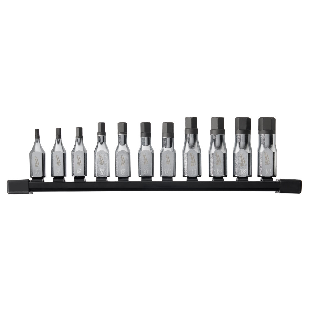 Our 11PC 3/8″ Drive Metric Hex Bit Socket Set with FOUR FLAT™ sides is designed from the ground up to be part of the most versatile socket family. Milwaukee® bit sockets feature an innovative design with four parallel flat sides, which deter rolling and are wrench-compatible. This also creates a slim profile to provide the best access in tight spaces. The one-piece socket design offers improved durability compared to two-piece designs by eliminating the risk of the bit separating from the socket base. This set includes a storage rail for better organization. Laser engraved size markings provide easy identification and chrome plating offers rust and corrosion protection. All Milwaukee® bit sockets are backed by a Lifetime Guarantee.