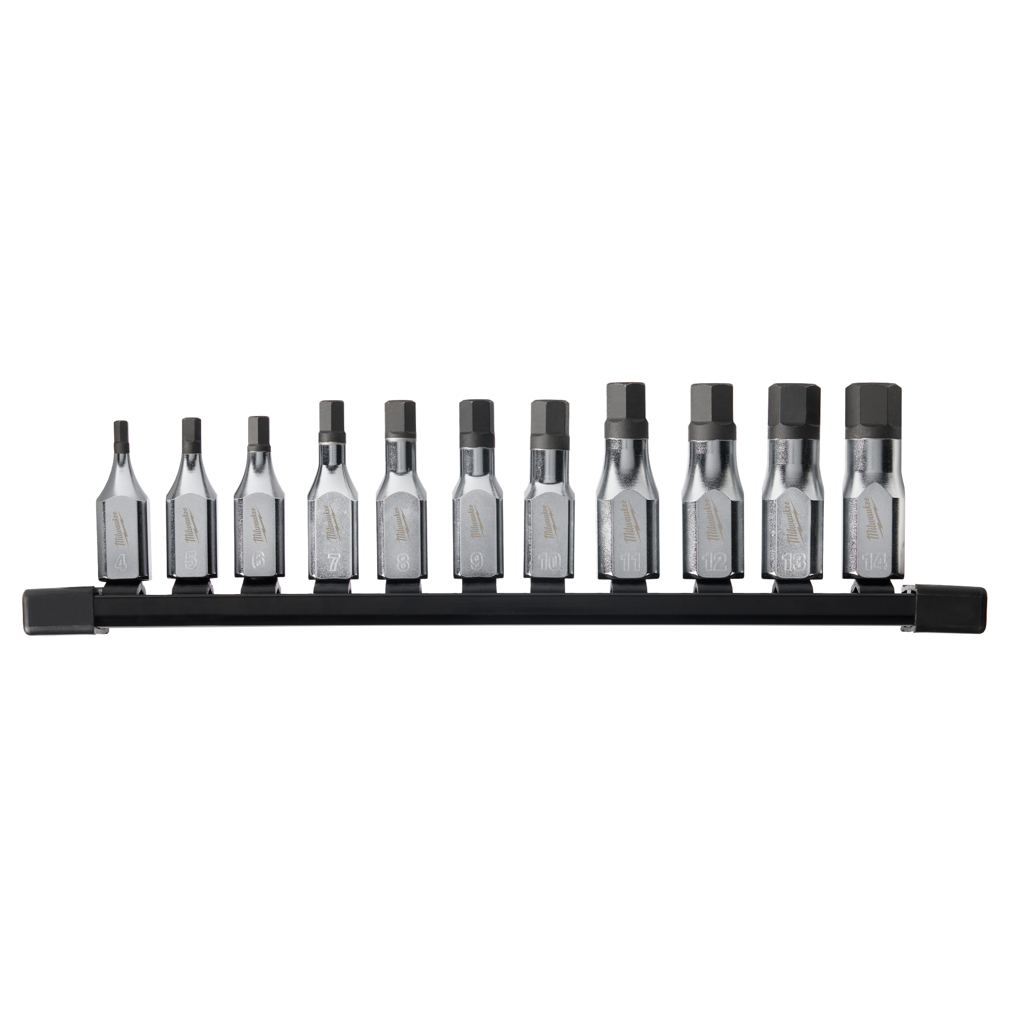 The MILWAUKEE® 11PC 3/8″ Drive Metric Hex Bit Socket Set with FOUR FLAT™ sides is designed from the ground up to be part of the most versatile socket family. Milwaukee® bit sockets feature an innovative design with four parallel flat sides, which deter rolling and are wrench-compatible. This also creates a slim profile to provide the best access in tight spaces. The one-piece socket design offers improved durability compared to two-piece designs by eliminating the risk of the bit separating from the socket base. This set includes a storage rail for better organization. Laser engraved size markings provide easy identification and chrome plating offers rust and corrosion protection. All Milwaukee® bit sockets are backed by a Lifetime Guarantee.