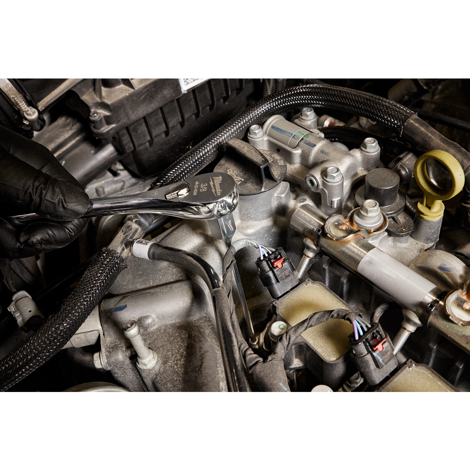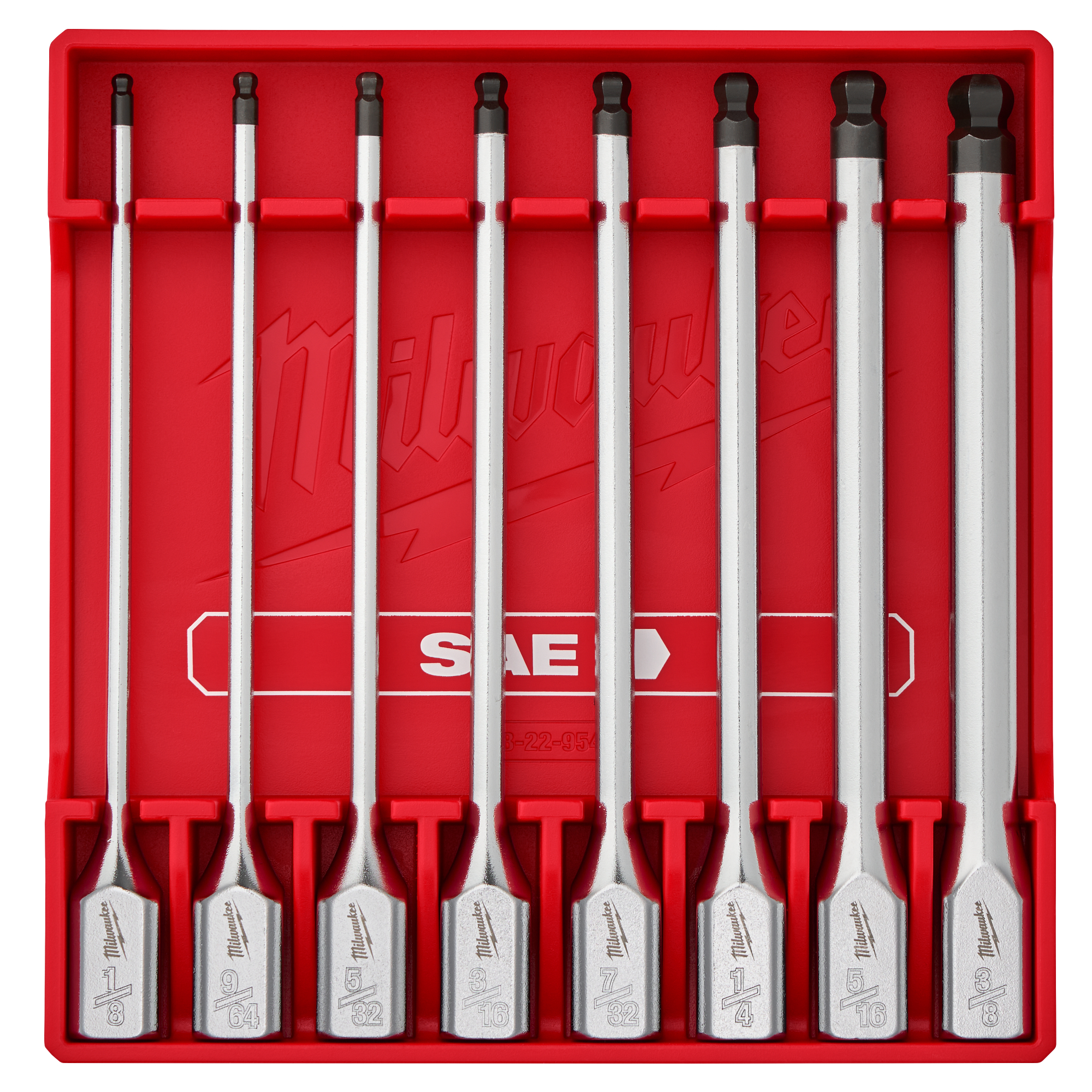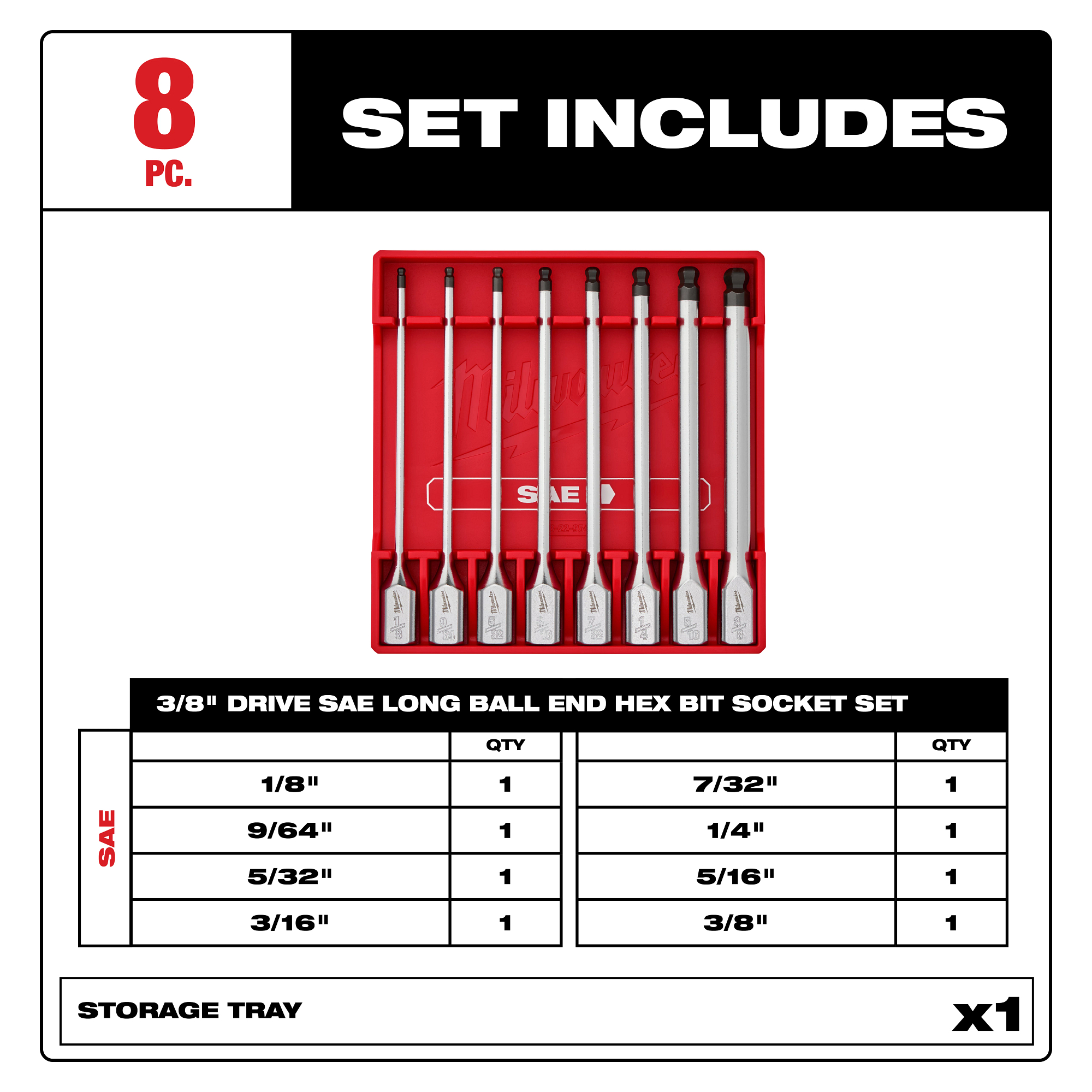 The MILWAUKEE® 8pc 3/8″ Drive SAE Long Ball End Bit Socket Set with FOUR FLAT™ sides is designed from the ground up to be part of the most versatile socket family. Milwaukee® long reach sockets feature an innovative design with four parallel flat sides, which deter rolling and are wrench compatible. The 6″ length and slim profile of these sockets provide the best access in tight spaces, and the ball end design provides easy angled entry. The one-piece socket design offers improved durability compared to two-piece designs by eliminating the risk of the bit separating from the socket base. The laser-engraved size markings provide easy identification, and chrome plating offers rust and corrosion protection. This set also includes a storage tray for better organization. All Milwaukee® sockets are backed by a Lifetime Guarantee.