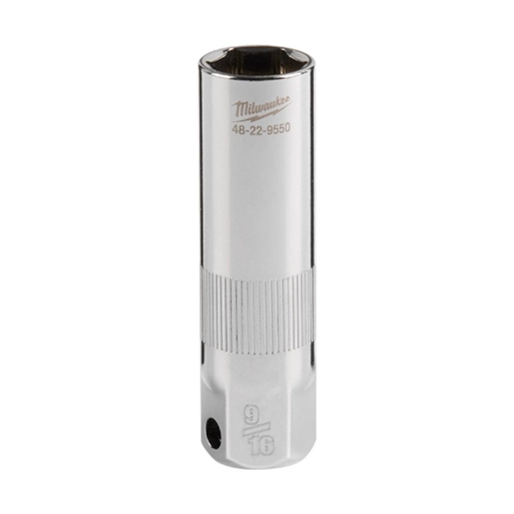 The MILWAUKEE® 3/8″ Drive 13/16″ 6-Point Spark Plug Socket features a durable dual-material rubber retainer designed to maintain a more secure fit within the socket while securely holding onto spark plugs to avoid dropping or damaging. A precision knurling on the outside of the spark plug socket allows for better control when hand tightening or loosening. Both the socket and retainer withstand harsh chemicals commonly found in the garage. Stamped size markings make it easy to identify the size of the socket. The external hex at the base of the socket fits a 13/16” wrench for added control. Milwaukee® Spark Plug Sockets are backed with a Lifetime Guarantee.