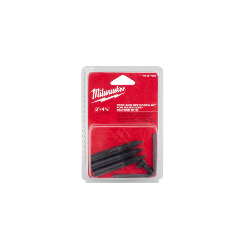 Extend the life of your Milwaukee Selfeed drill bits with the feed and set screw kit. The aggressive feed screw thread design allows the bit to be pulled through the wood faster resulting in faster drilling. The kit includes3 feed screws 2 set screws and a hex key for quick change outs on Milwaukee Selfeed drill bits sized 3 in. to 4-5/8 in. Use only Milwaukee specified replacement parts to achieve maximum life and performance from your Milwaukee Tool.