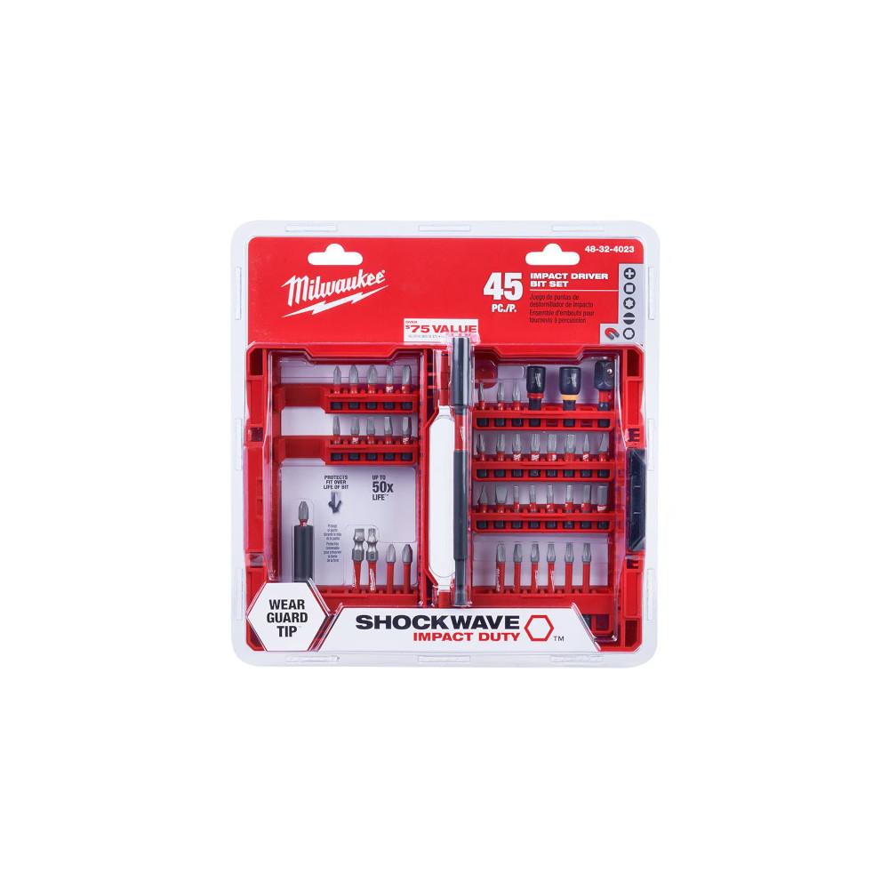 The MILWAUKEE 45 piece SHOCKWAVE Impact Duty driver bit set is engineered to be the most durable, best fitting driver bits on the market. The Shock Zone geometry is optimized for each tip type to provide up to 30X longer life and absorb 3X more torque versus other impact driver bits. Custom machined tips prevent stripping and reduce wobbling while the impact bits are in use. SHOCKWAVE driver bits are made from custom alloy 76 steel and built to deliver extreme durability for the most demanding applications. SHOCKWAVE Impact Duty driver bits can be used in impact drivers or drill drivers to get the job done every time.
