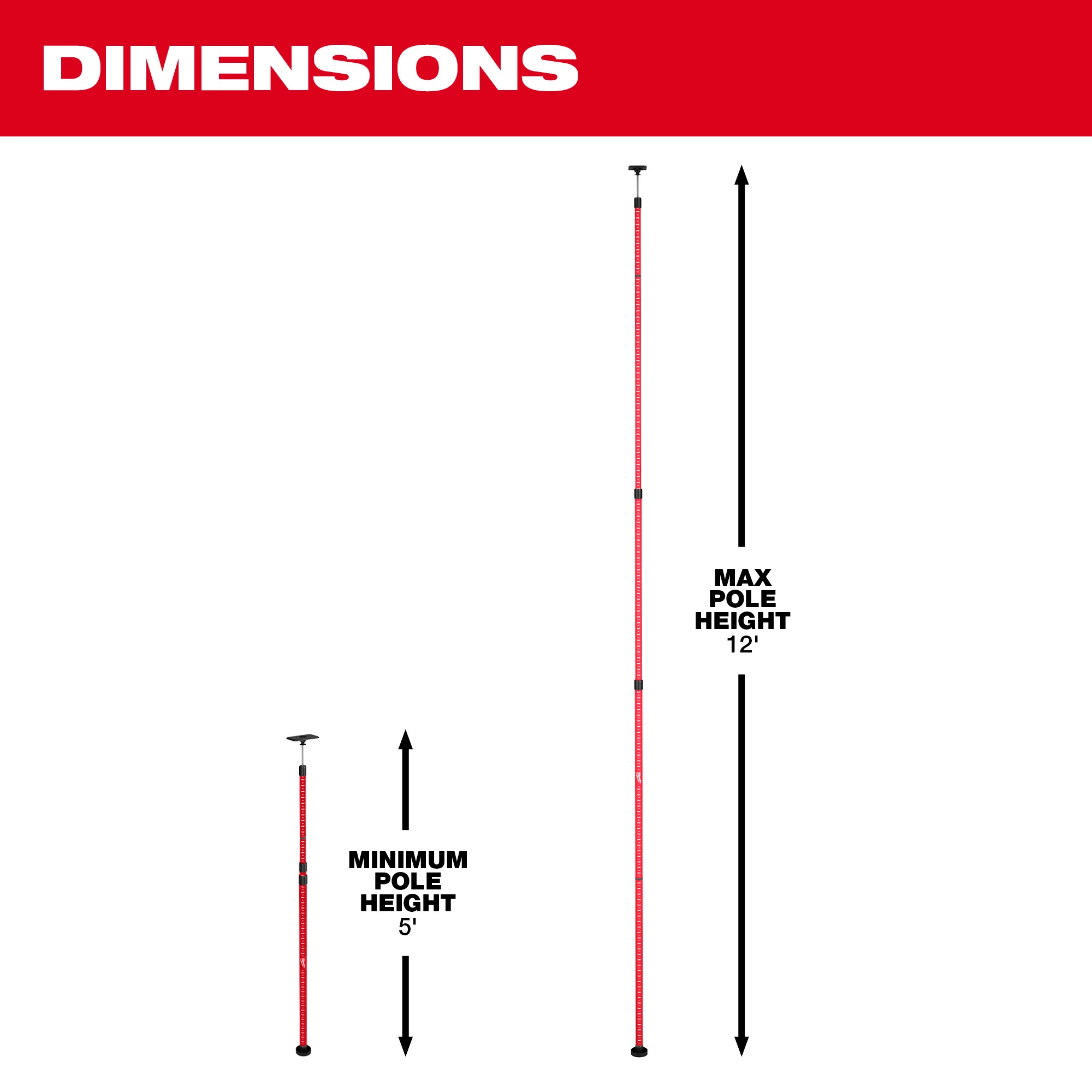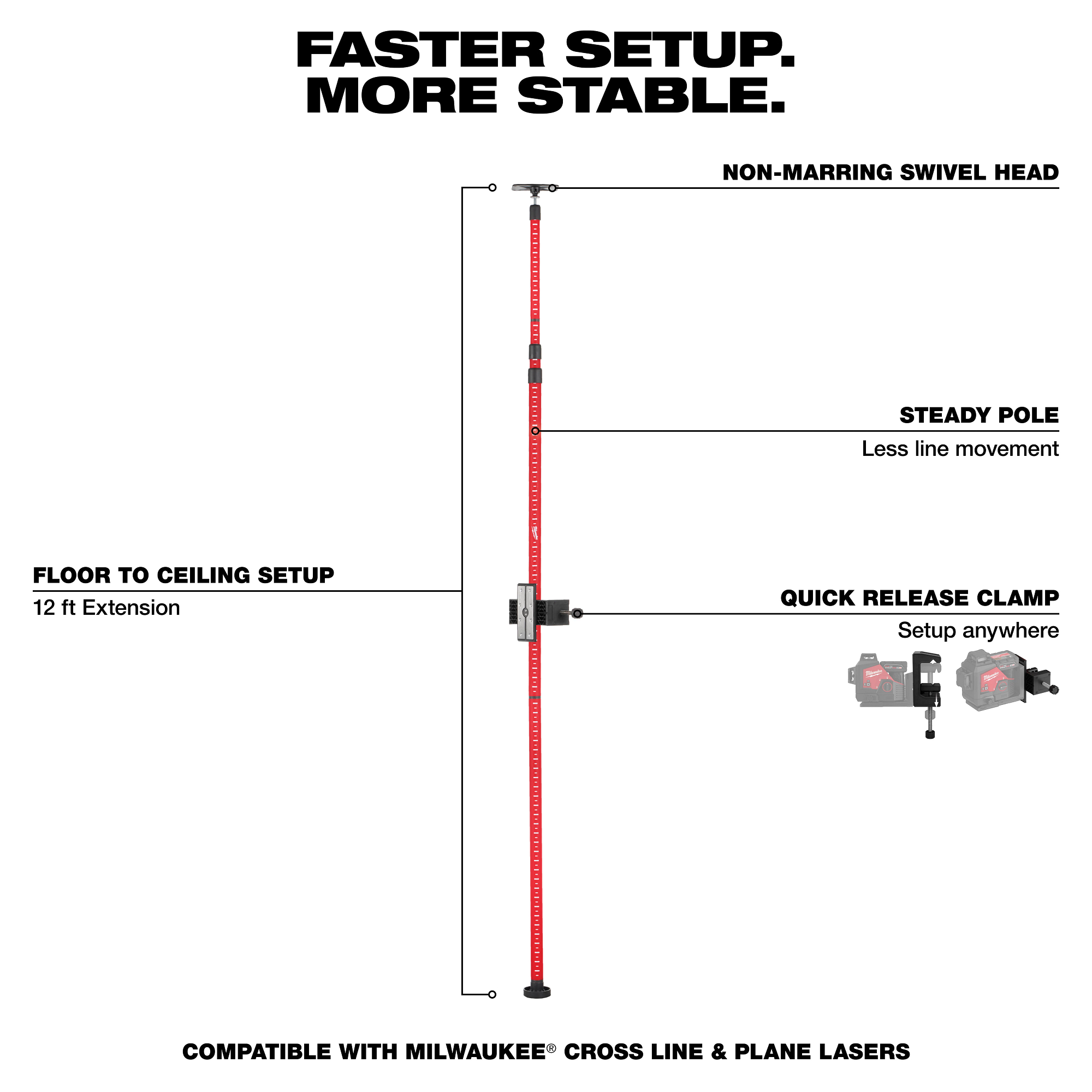 The MILWAUKEE® 12′ Telescoping Laser Pole is designed to provide a faster set-up and a more stable laser line. The telescopic laser pole features threaded and telescoping sections for easy set-up and a secure fitment in interior environments. The quick-release laser pole clamp and reference marks allow effortless laser set-up at the correct elevation, and the non-marring swivel top plate leaves no scuff marks. The lightweight, durable aluminum body ensures it will survive the jobsite, and the heavy-duty carrying case keeps it protected during transport. The Telescoping Laser Pole is backed by a three-year limited warranty.