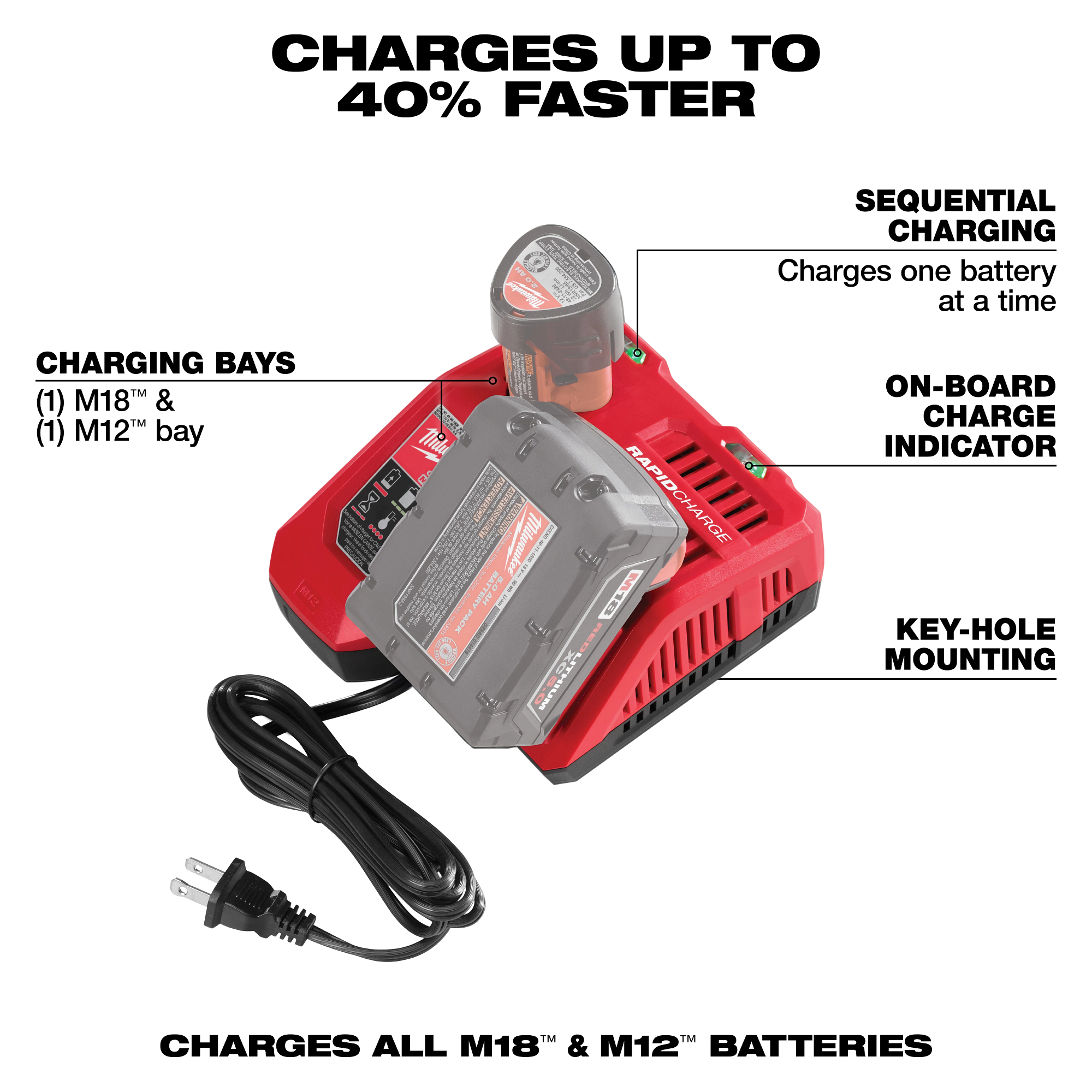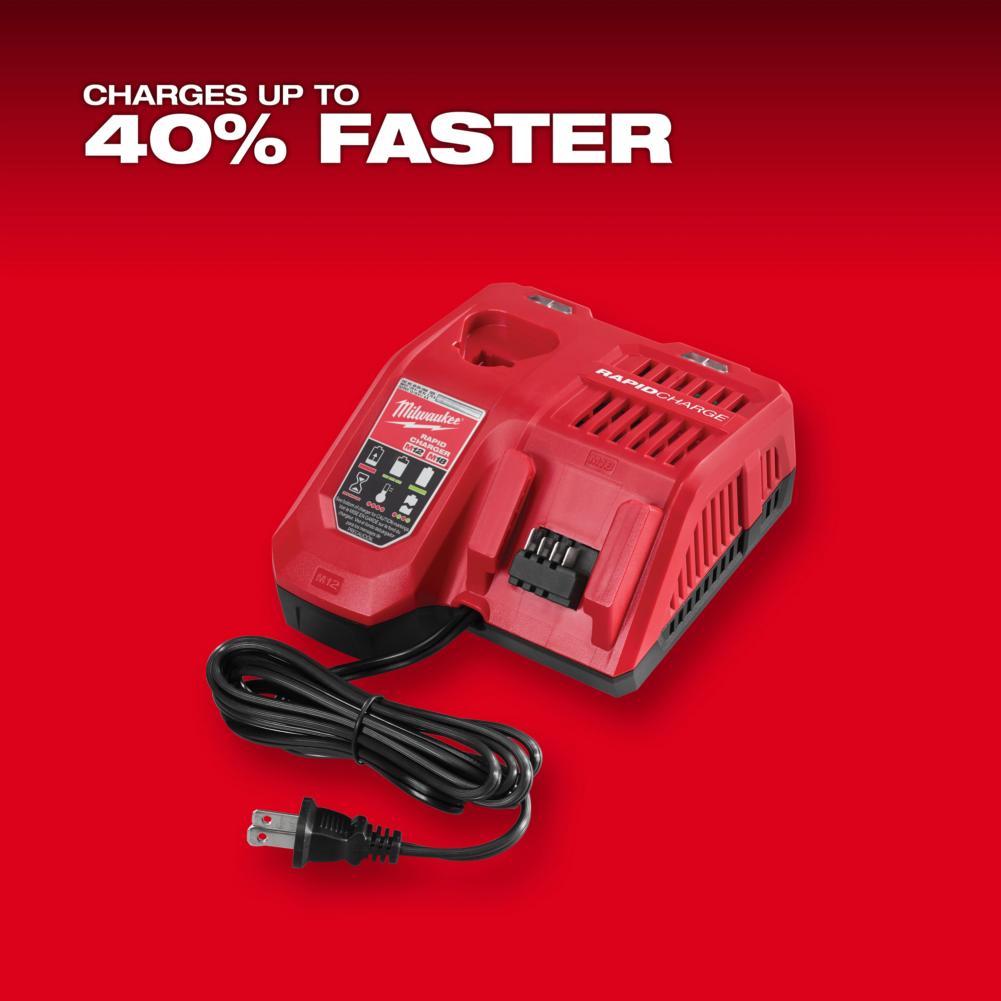 The M18™ & M12™ rapid charger charges packs up to 40% faster, reducing downtime and maximizing productivity. The charger accepts all M18™ and M12™ batteries, providing an upgrade for both systems. Featuring REDLINK™ Intelligence, it communicates directly with the battery to monitor cell voltage, temperature, and charge status to optimize the performance and extend the life of the pack. As an added level of communication, the charger indicates when the battery reaches an 80% charge, providing confidence that a substantial amount of work can be completed without waiting for a full charge.