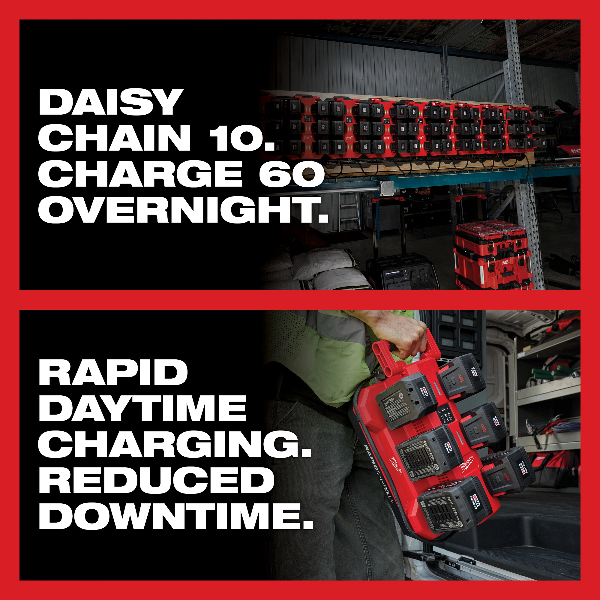 The MILWAUKEE® M18™ Six Bay Daisy Chain Rapid Charger is the most versatile shop-to-mobile charging solution. The Six Bay Daisy Chain Rapid Charger features dual charge modes for optimized rapid daytime or overnight charging. For bulk M18™ battery charging, 10 chargers can be daisy-chained together to recharge 60 M18™ packs overnight, all on a single 15A circuit. For daytime charging, rapid mode charges M18™ batteries at a 2X faster rate than standard chargers and will charge two batteries simultaneously, getting you back to work faster. Spend less time swapping batteries on the jobsite by managing six batteries in a consolidated portable charging experience. This M18™ battery charger is optimized for transportation and designed for charging on the go. The M18™ Daisy Chain Rapid Charger is PACKOUT™ compatible and can be integrated into shop or mobile spaces using the PACKOUT™ Wall Plates or transported to sites on your PACKOUT™ stack or the convenient carry handle. The M18™ Six Bay Daisy Chain Rapid Charger provides crews and users with the optimal charging experience for their bulk M18™ battery charging needs.