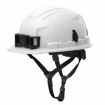 - Includes: (1) White 4PT Front Brim Non-Vented Safety Helmet (USA) – Type 2, Class E (48-73-1521); (1) Marker Clip; (1) Headlamp Mount