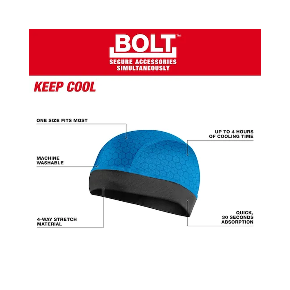 Our BOLT™ Cooling Skull Cap is designed to be activated by water and features microfiber technology to keep you cool on the jobsite. This sweatband can be quickly activated by running or submerging it under water for 30 seconds for full absorption. Wring out any excess water and repeat when dry. When activated, the Cooling Skull Cap will wick away moisture and heat giving you up to 4 hours of cooling time. Designed to be compatible with MILWAUKEE® Safety Helmets and Hard Hats, our Cooling Skull Cap will provide long-lasting comfort with its comfortable, 4-way stretch material and is part of the BOLT™ Accessory System which allows our users to secure accessories simultaneously.