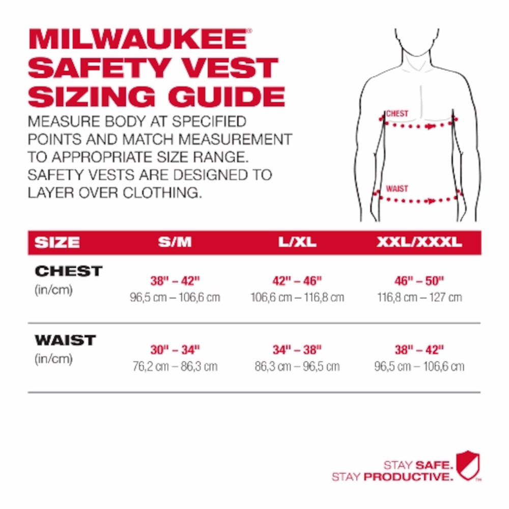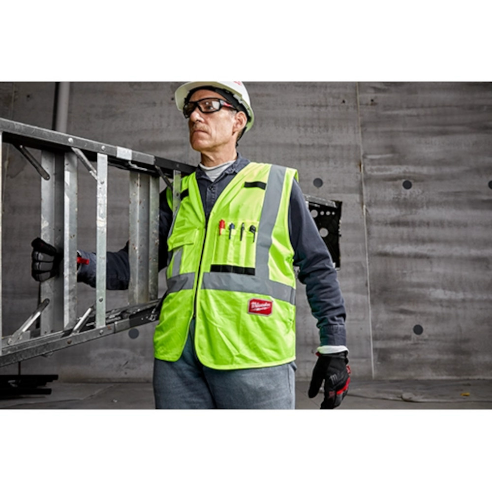 Our ANSI Type R Class 2 High Visibility Safety Vests are designed to carry more. The high-visibility safety vest has 10 pockets, including a clear ID holder and an internal pocket for additional storage. These safety vests feature a quick internal size adjustment, providing you with a better fit and a durable pass-through slit for fall protection gear. The size adjustment allows you to wear these MILWAUKEE® safety vests in the summer over a t-shirt or in the winter over a jacket. The zipper closure delivers you ultimate jobsite security.