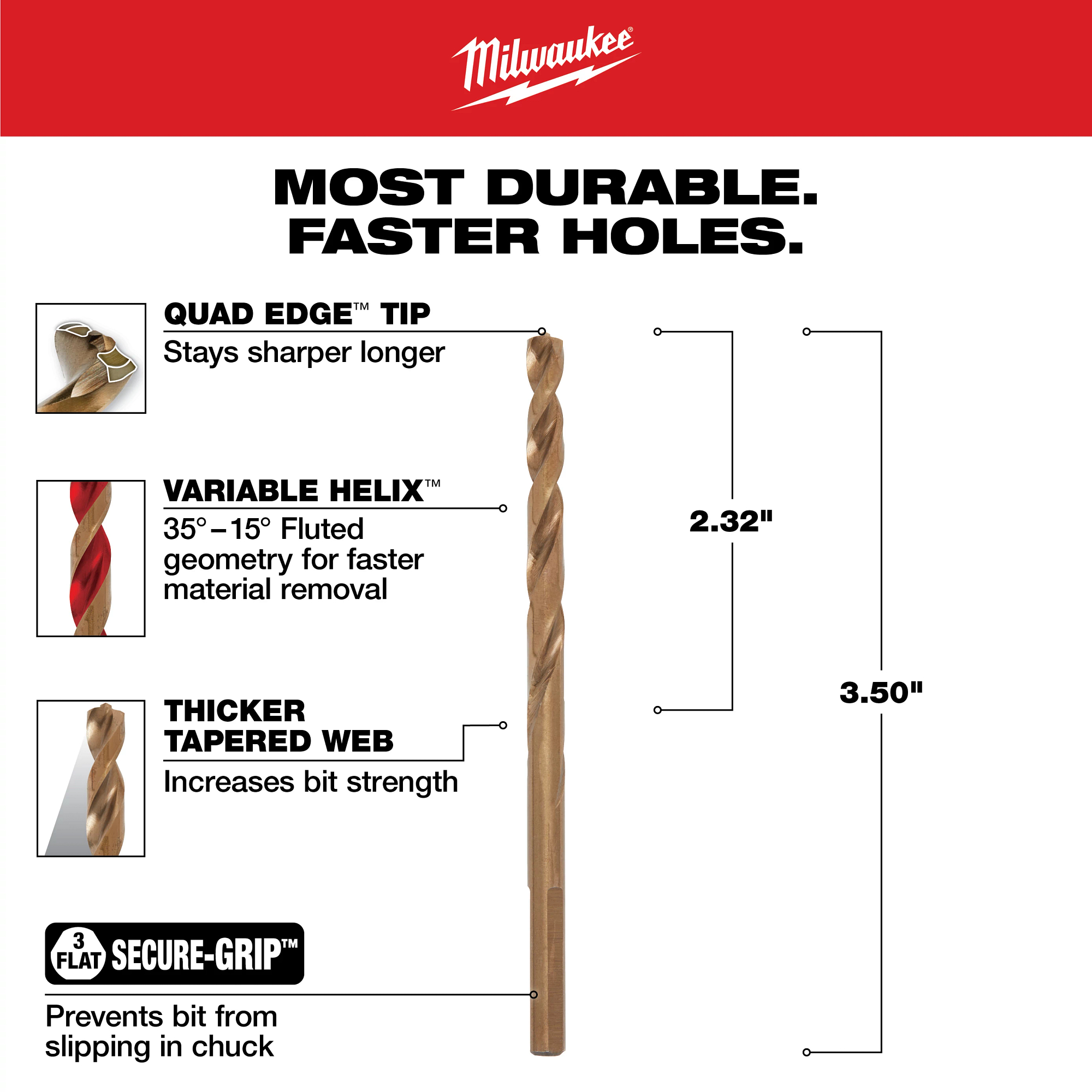 Milwaukee® COBALT RED HELIX™ drill bits are engineered for extreme durability and long life in hard metal applications. Designed with a variable helix ™ that includes an aggressive 35° helix angle which ends at 15°, the cobalt bits with RED HELIX™ provide Rapid Chip Removal™ limiting heat buildup to Stay Sharper Longer™. The 135° split point tip delivers a precision start and prevents walking for fast, accurate holes. Ideal for tough applications and provide up to 10X life vs. Black Oxide Drill Bits™ but can be used in all twist drilling applications.