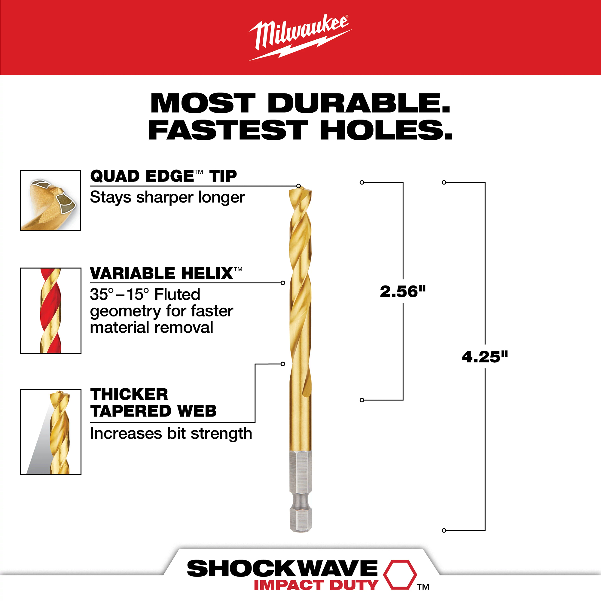 The MILWAUKEE® 9/32″ SHOCKWAVE™ RED HELIX™ Titanium Drill Bit is engineered for extreme durability and long life. The QUAD EDGE™ tip delivers a precision start and four cutting edges to create smaller chips for faster removal and less heat leading to longer bit life. Designed with a Variable Helix ™ that includes an aggressive 35° helical angle, which ends at 15°, this titanium drill bit with RED HELIX™ provide Rapid Chip Removal™ limiting heat buildup to Stay Sharper Longer™. The bit also features an internal ENHANCED TAPERED WEB that greatly increases the strength of the bit, reducing premature breakage. Ideal for various applications including but not limited to wood, plastics, and metals, Milwaukee Red Helix Titanium Drill Bits provide up to 5X life vs. black oxide drill bits.
