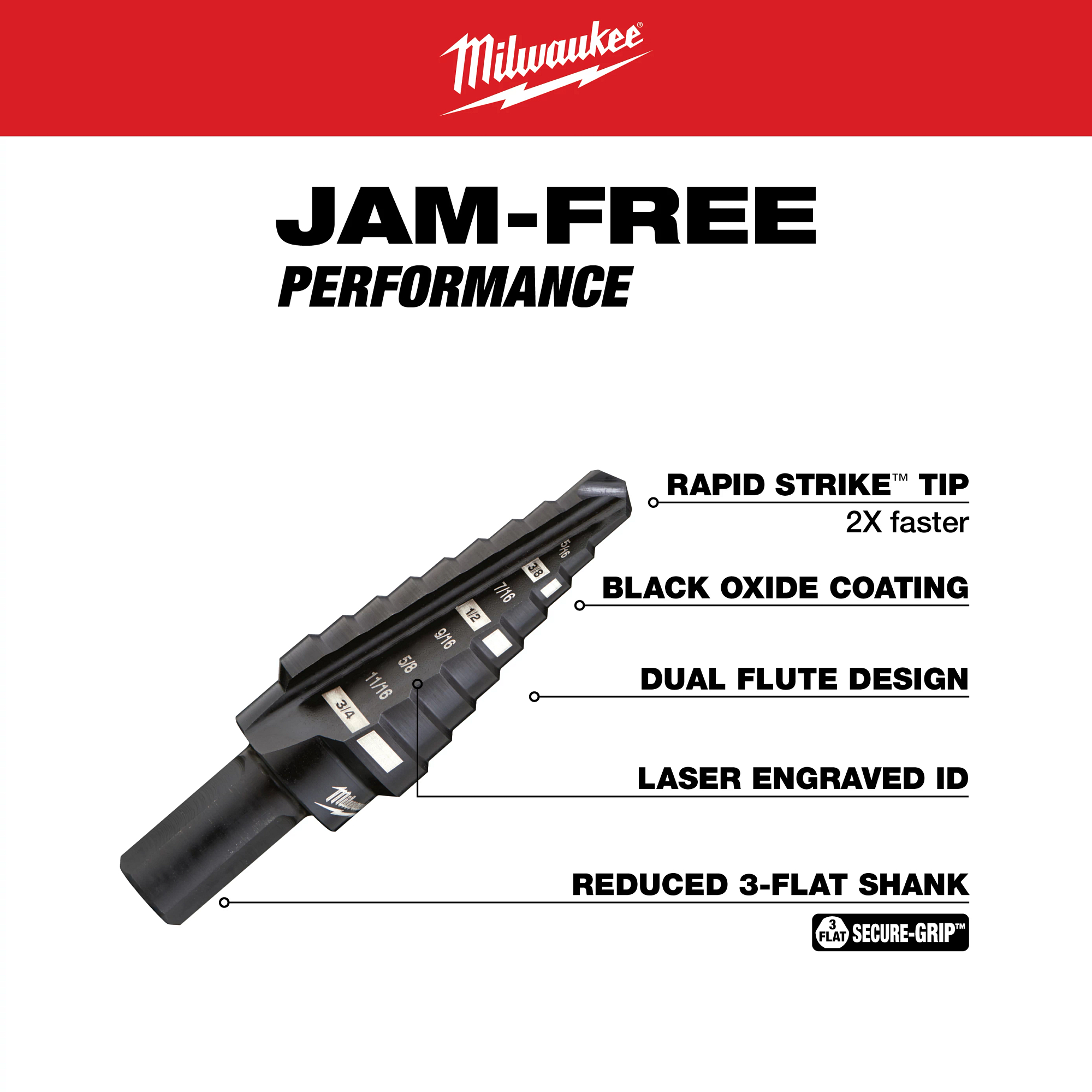 Milwaukee® step drill bits with jam-free performance feature a dual-flute design delivering up to 2X faster hole times, up to 4X longer life and up to 50% more holes per battery charge than competitors. Ideal for drilling small and large-diameter holes in steel and plastic, these bits are optimized for cordless drills in high speed. The Rapid Strike™ tip allows for a fast and accurate start that generates less heat, resulting in longer bit tip life. Black oxide coating also enhances durability, hole quality and bit life. For user convenience and accuracy, each bit has laser-engraved reference marks you can see while drilling. The 3-flat Secure-Grip™ shank ensures a solid connection with the drill chuck. The #3 step drill bit has 9 hole sizes in 1/16 in. increments ranging from 1/4 in. to 3/4 in. jam-free performance in high speed with most professional 18 Volt cordless drills with lithium-ion battery technology.