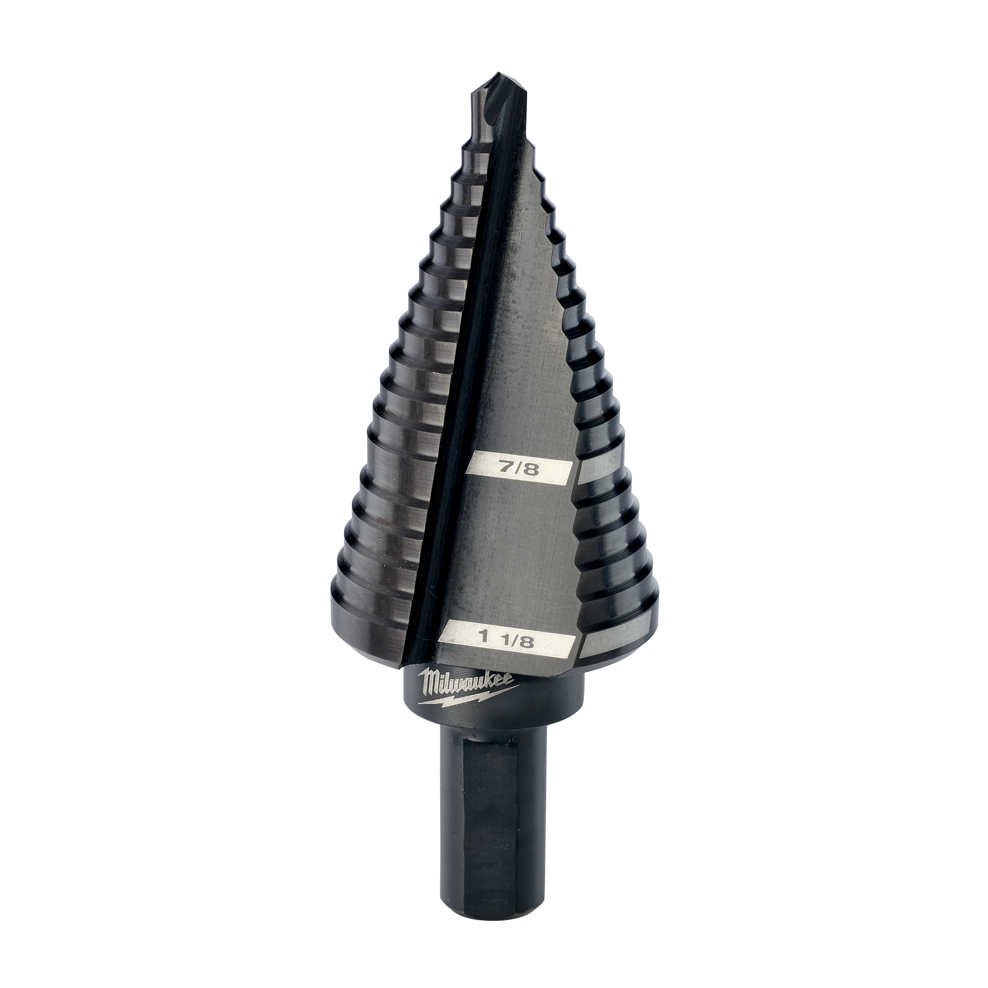 The MILWAUKEE® step drill bits with jam-free performance feature a dual-flute design delivering up to 2X faster hole times, up to 4X longer life and up to 50% more holes per battery charge than the competition. Ideal for drilling large and small-diameter holes in steel and plastic, these bits are optimized for cordless drills in high speed. The Rapid Strikeâ„¢ tip allows for fast, accurate starts that generate less heat, resulting in longer bit tip life. Black oxide coating also enhances durability, hole quality and bit life. For user convenience and accuracy, each bit has laser-engraved reference marks you can see while drilling. The 3-flat Secure-Gripâ„¢ shank ensures a solid connection with the drill chuck. The #9 step drill bit has 2 hole sizes: 7/8″ and 1-1/8″. jam-free performance in high speed with most professional 18 Volt cordless drills with lithium-ion battery technology.