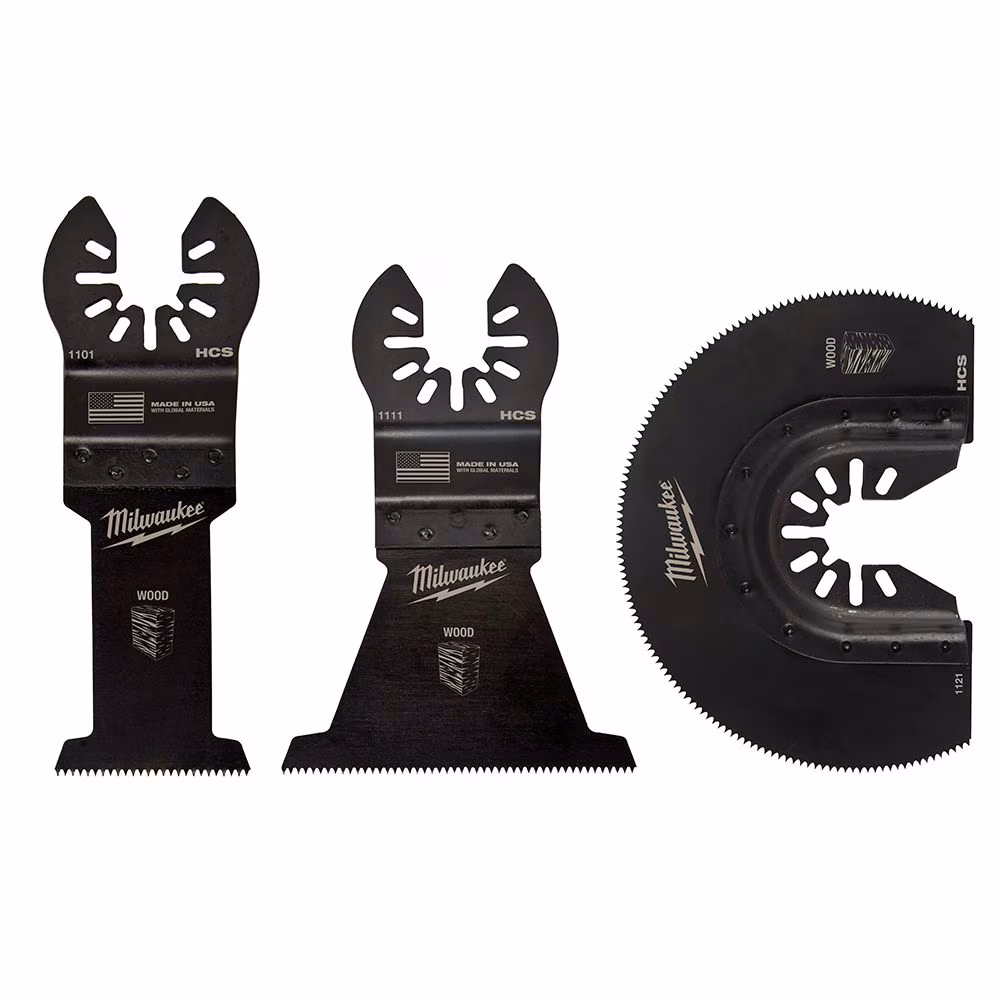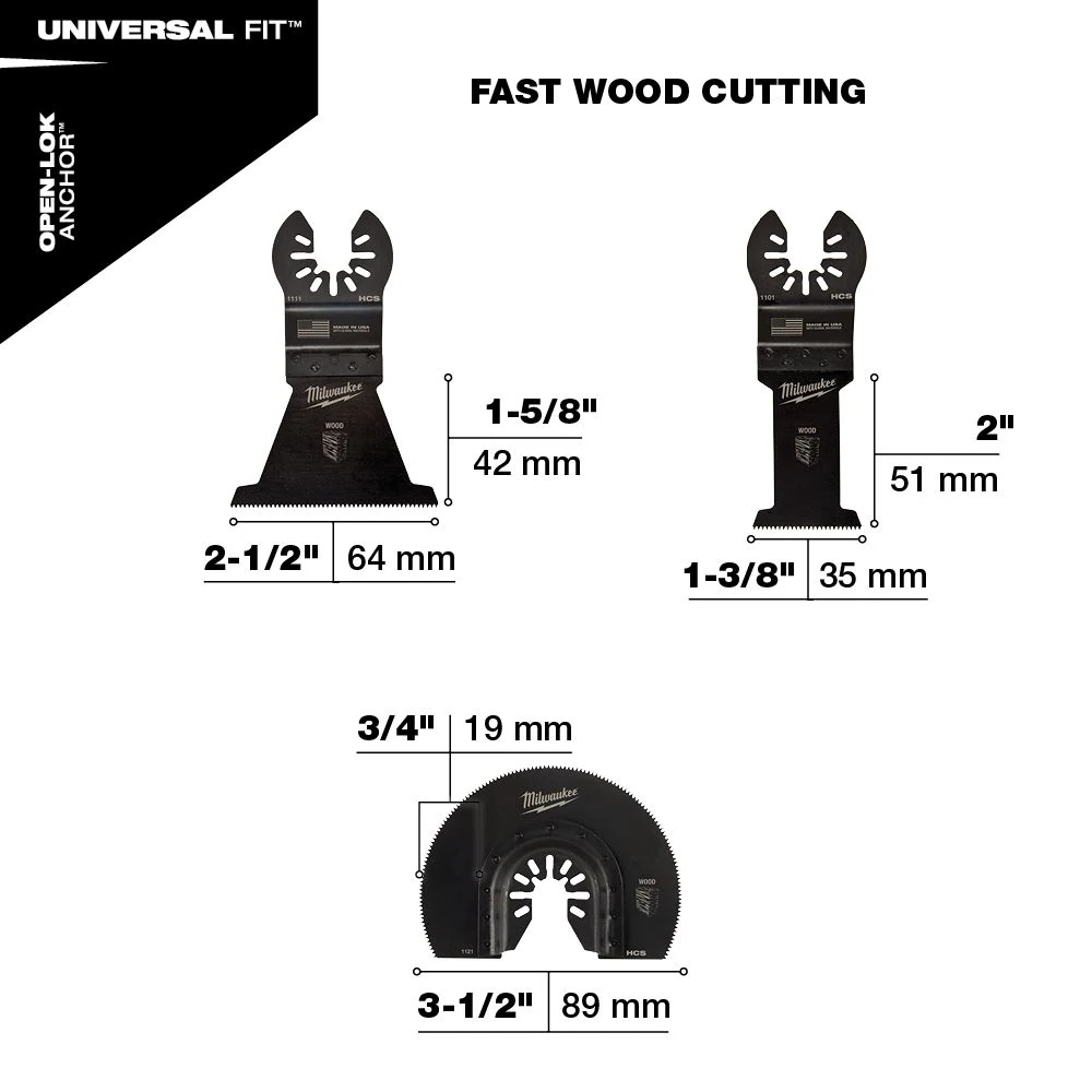 The Milwaukee Universal Fit OPEN-LOK 3-Piece Wood Cutting Oscillating Multi-Tool Variety Pack offers users an assortment of their next-generation oscillating blades for optimal cutting performance in wood, PVC, drywall, and other soft materials. The oscillating wood blades are designed with aggressive, precision ground teeth for fast cuts in wood, drywall, and PVC. A 1-3/8 -inch end-cut blade, a 2-1/2 -inch end-cut blade, and 3-1/2 -inch segmented blade offer versatile cutting to ensure users have the right blade for the right cut. This oscillating tool blade variety pack is designed with global materials.