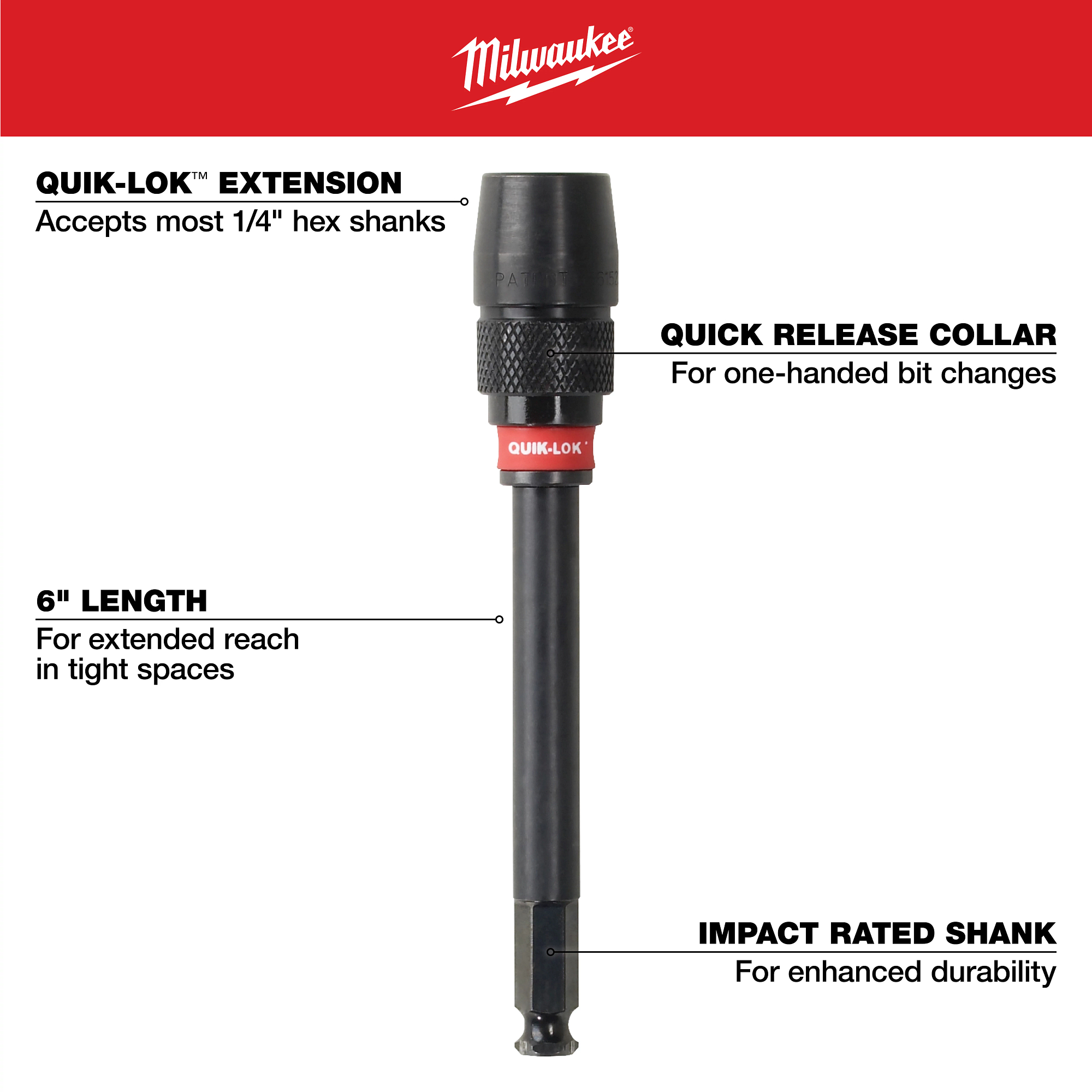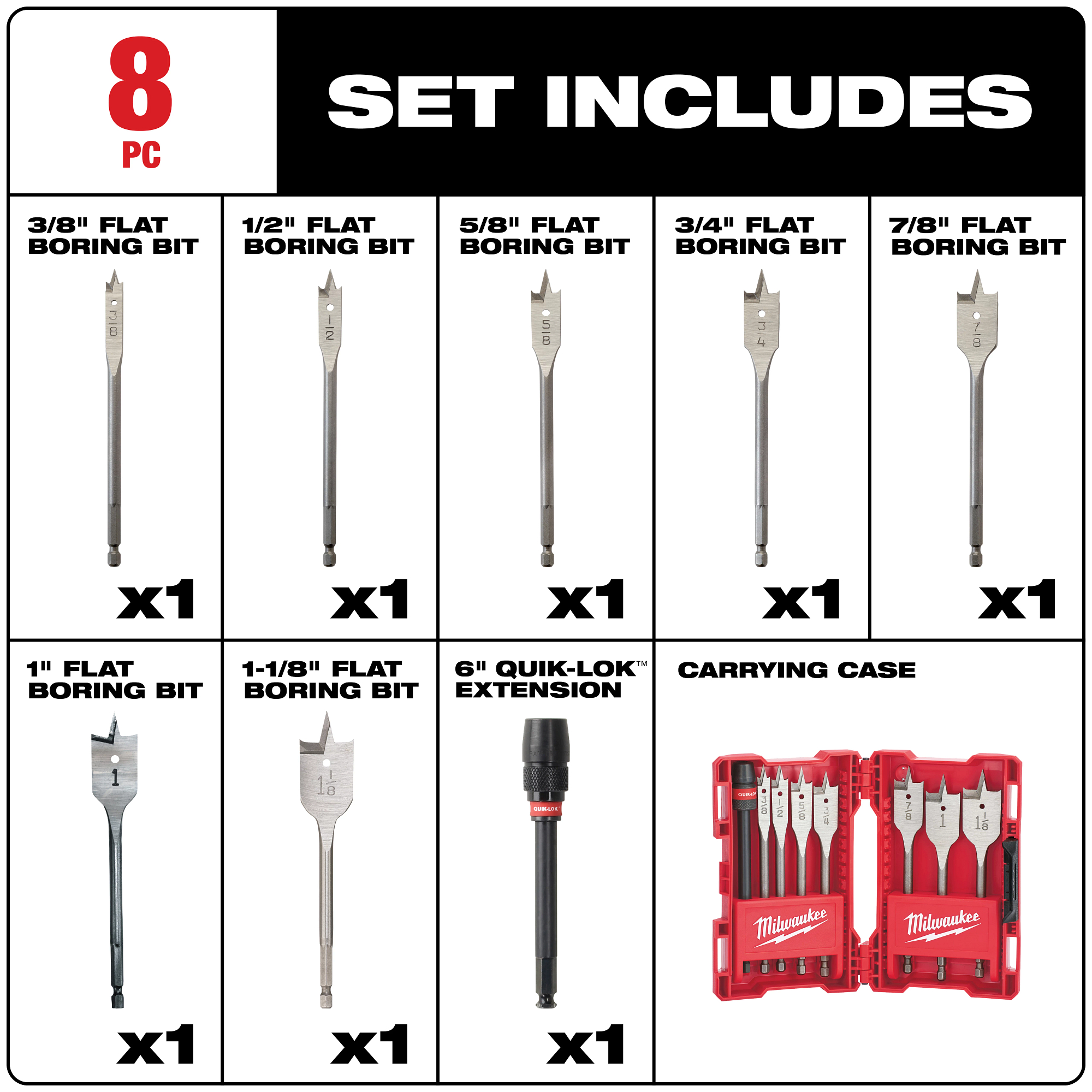 Get added convenience and reach with the Milwaukee® 8-piece 6 in. universal Quik-Lok™ flat boring bit set. Bore small, clean holes at any angle in a variety of materials. The double wing spurs provide easy hole formation while reducing vibration and preventing break out. The patented cutting edge produces easier and faster wood boring and fast chip removal, allowing heat from the bit to dissipate. The universal Quik-Lok™ allows quick and easy accessory changes, as well as added reach in hard-to-work areas. The kit includes 3/8 in., 1/2 in., 5/8 in., 3/4 in., 7/8 in., 1 in. and 1-1/8 in. bits plus a 6 in. Quik-Lok extension in a carrying case.