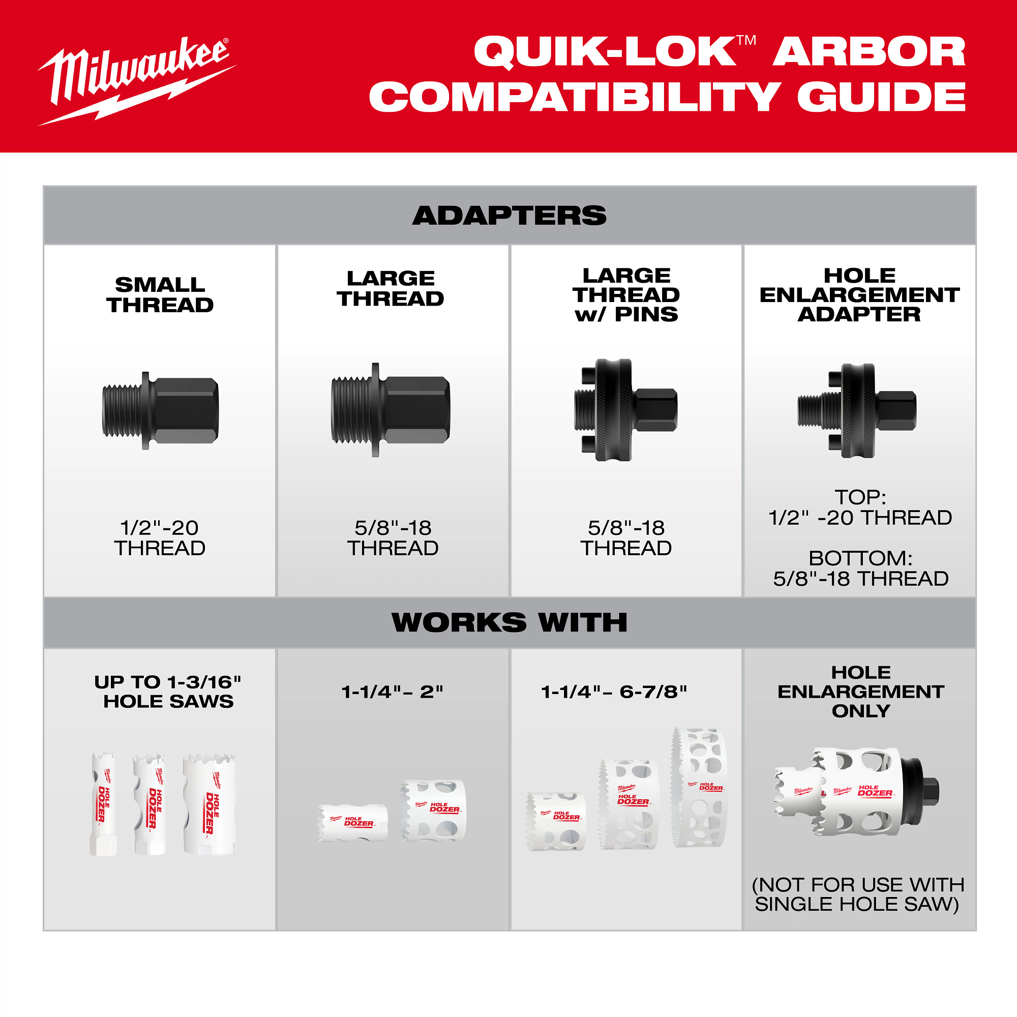 The MILWAUKEE® QUIK-LOK™ Arbor Set provides a universal fit with all industry standard threaded hole saw sizes and offers the fastest hole saw changes. The included adapters ensure compatibility with small-thread and large-hole saws and eliminate the need for multiple arbors, saving you time and money. Our QUIK-LOK™ system is designed with the ultimate durability to deliver the strength and reliability to match the all-day demands of the job site. Due to the threaded design, this system retains Hole Enlargement capability. The Reusable Pin Adapter is compatible with hole saws from 1-1/4″ up to 6-7/8″ without the risk of thread stripping or binding and retains Hole Enlargement capability for 1-1/4″+ hole saws. The Small Thread Adapter is intended for hole saws from 9/16″ to 1-3/16″. The Large Thread Adapter is intended for hole saws from 1-1/4″ up to 2″.