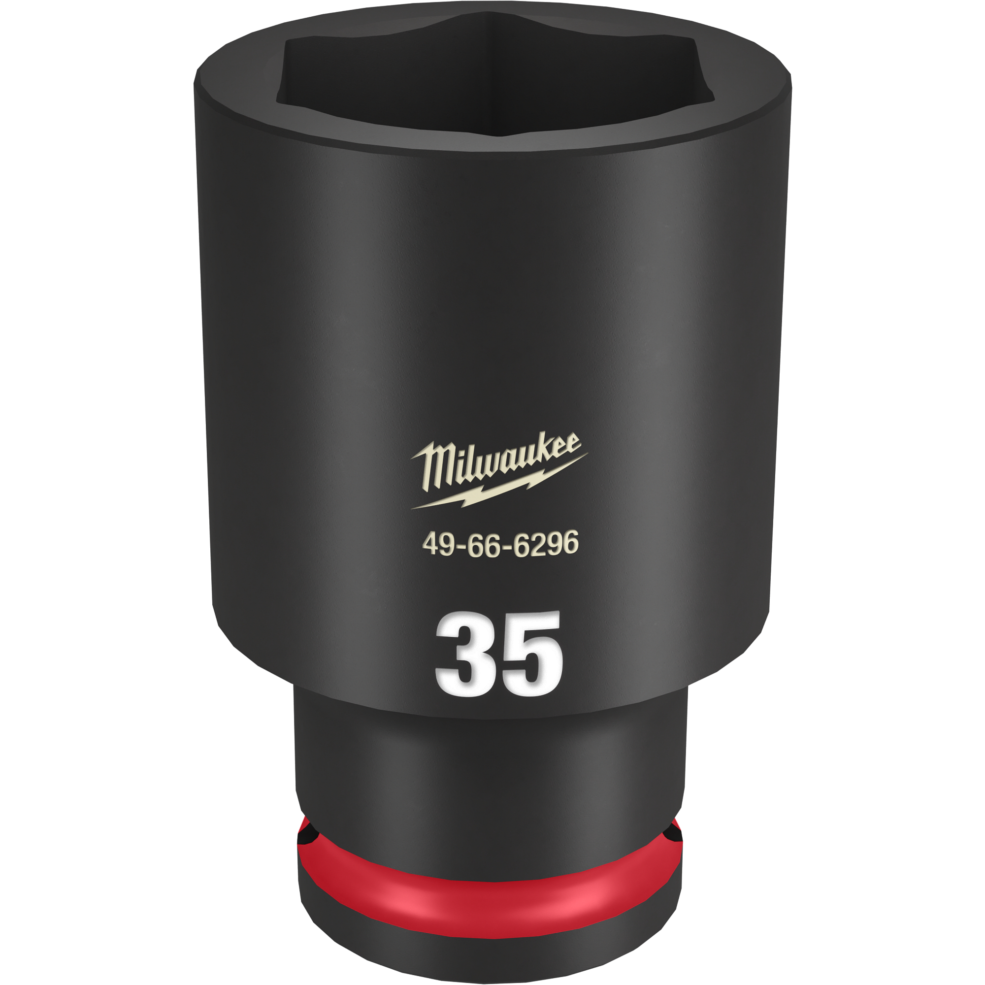 The MILWAUKEE® SHOCKWAVE Impact Duty™ 1/2″ Drive 35MM Deep 6 Point Socket features the boldest, longest-lasting markings and extreme impact durability in high torque applications. The stamped and ink-filled size marking enables an accurate socket selection every time throughout the life of the socket. Engineered with high-strength forged steel for optimized performance in heavy-duty applications, and a non-slip hex geometry prevents fastener rounding. The dual-hole design and ring groove allow for easy socket attachment and removal. All SHOCKWAVE Impact Duty™ Sockets are backed by a Lifetime Guarantee and meet ASME industry standards.