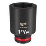 The MILWAUKEE® SHOCKWAVE Impact Duty™ 3/4″ Drive 1-11/16″ Deep 6 Point Socket features the boldest, longest-lasting markings and extreme impact durability in high torque applications. The stamped and ink-filled size marking enables an accurate socket selection every time throughout the life of the socket. Engineered with high-strength forged steel for optimized performance in heavy-duty applications, and a non-slip hex geometry prevents fastener rounding. The dual-hole design and ring groove allow for easy socket attachment and removal. All SHOCKWAVE Impact Duty™ Sockets are backed by a Lifetime Guarantee and meet ASME industry standards. Compatible with optional Retaining Ring (49-66-6744).