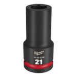 The MILWAUKEE® SHOCKWAVE Impact Duty™ 3/4″ Drive 21MM Deep 6 Point Socket features the boldest, longest-lasting markings and extreme impact durability in high torque applications. The stamped and ink-filled size marking enables an accurate socket selection every time throughout the life of the socket. Engineered with high-strength forged steel for optimized performance in heavy-duty applications, and a non-slip hex geometry prevents fastener rounding. The dual-hole design and ring groove allow for easy socket attachment and removal. All SHOCKWAVE Impact Duty™ Sockets are backed by a Lifetime Guarantee and meet ASME industry standards. Compatible with optional Retaining Ring (49-66-6744).