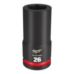 The MILWAUKEE® SHOCKWAVE Impact Duty™ 3/4″ Drive 26MM Deep 6 Point Socket features the boldest, longest-lasting markings and extreme impact durability in high torque applications. The stamped and ink-filled size marking enables an accurate socket selection every time throughout the life of the socket. Engineered with high-strength forged steel for optimized performance in heavy-duty applications, and a non-slip hex geometry prevents fastener rounding. The dual-hole design and ring groove allow for easy socket attachment and removal. All SHOCKWAVE Impact Duty™ Sockets are backed by a Lifetime Guarantee and meet ASME industry standards. Compatible with optional Retaining Ring (49-66-6744).