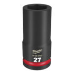 The MILWAUKEE® SHOCKWAVE Impact Duty™ 3/4″ Drive 27MM Deep 6 Point Socket features the boldest, longest-lasting markings and extreme impact durability in high torque applications. The stamped and ink-filled size marking enables an accurate socket selection every time throughout the life of the socket. Engineered with high-strength forged steel for optimized performance in heavy-duty applications, and a non-slip hex geometry prevents fastener rounding. The dual-hole design and ring groove allow for easy socket attachment and removal. All SHOCKWAVE Impact Duty™ Sockets are backed by a Lifetime Guarantee and meet ASME industry standards. Compatible with optional Retaining Ring (49-66-6744).