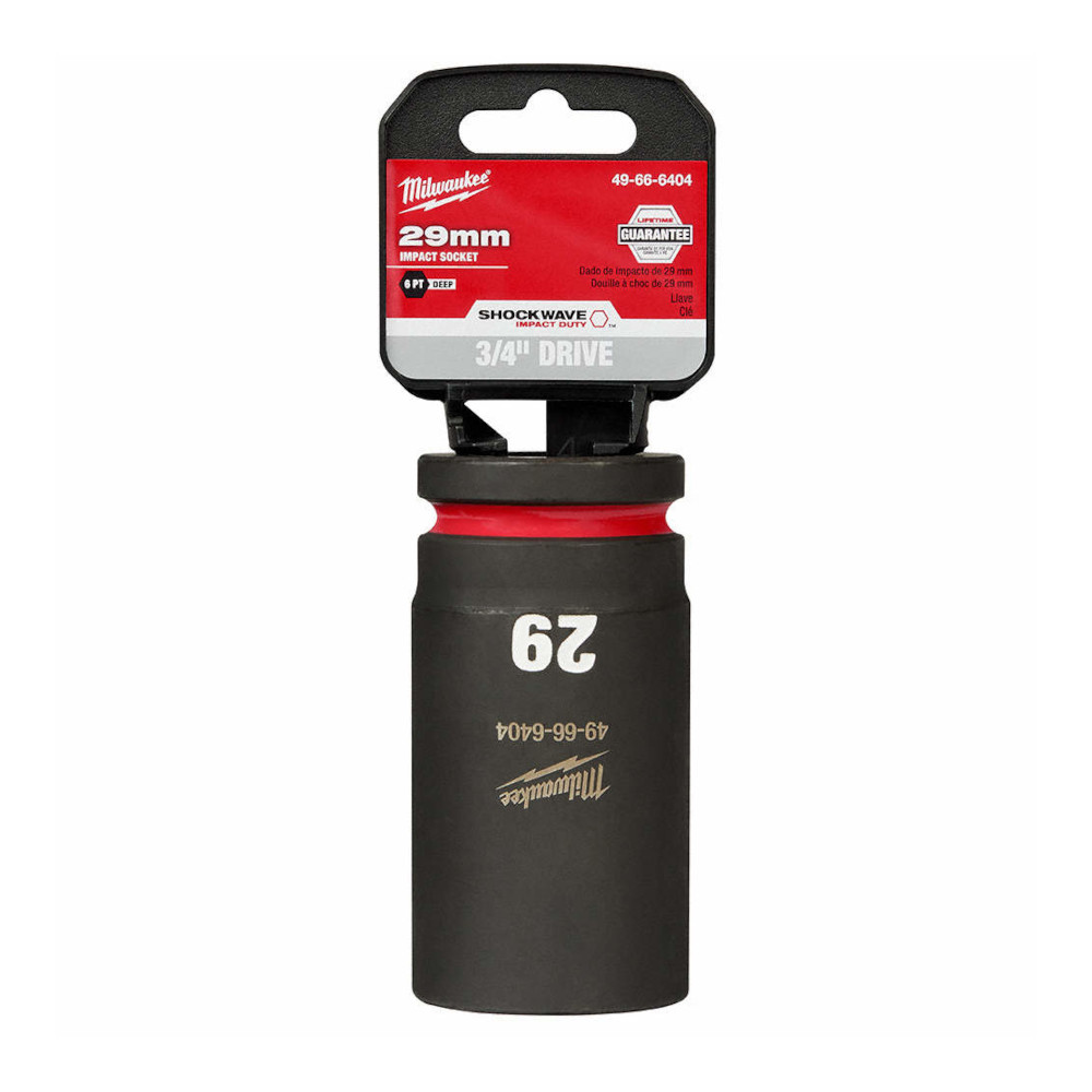 The MILWAUKEE® SHOCKWAVE Impact Duty™ 3/4″ Drive 29MM Deep 6 Point Socket features the boldest, longest-lasting markings and extreme impact durability in high torque applications. The stamped and ink-filled size marking enables an accurate socket selection every time throughout the life of the socket. Engineered with high-strength forged steel for optimized performance in heavy-duty applications, and a non-slip hex geometry prevents fastener rounding. The dual-hole design and ring groove allow for easy socket attachment and removal. All SHOCKWAVE Impact Duty™ Sockets are backed by a Lifetime Guarantee and meet ASME industry standards. Compatible with optional Retaining Ring (49-66-6744).