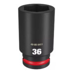 The MILWAUKEE® SHOCKWAVE Impact Duty™ 3/4″ Drive 36MM Deep 6 Point Socket features the boldest, longest-lasting markings and extreme impact durability in high torque applications. The stamped and ink-filled size marking enables an accurate socket selection every time throughout the life of the socket. Engineered with high-strength forged steel for optimized performance in heavy-duty applications, and a non-slip hex geometry prevents fastener rounding. The dual-hole design and ring groove allow for easy socket attachment and removal. All SHOCKWAVE Impact Duty™ Sockets are backed by a Lifetime Guarantee and meet ASME industry standards. Compatible with optional Retaining Ring (49-66-6744).