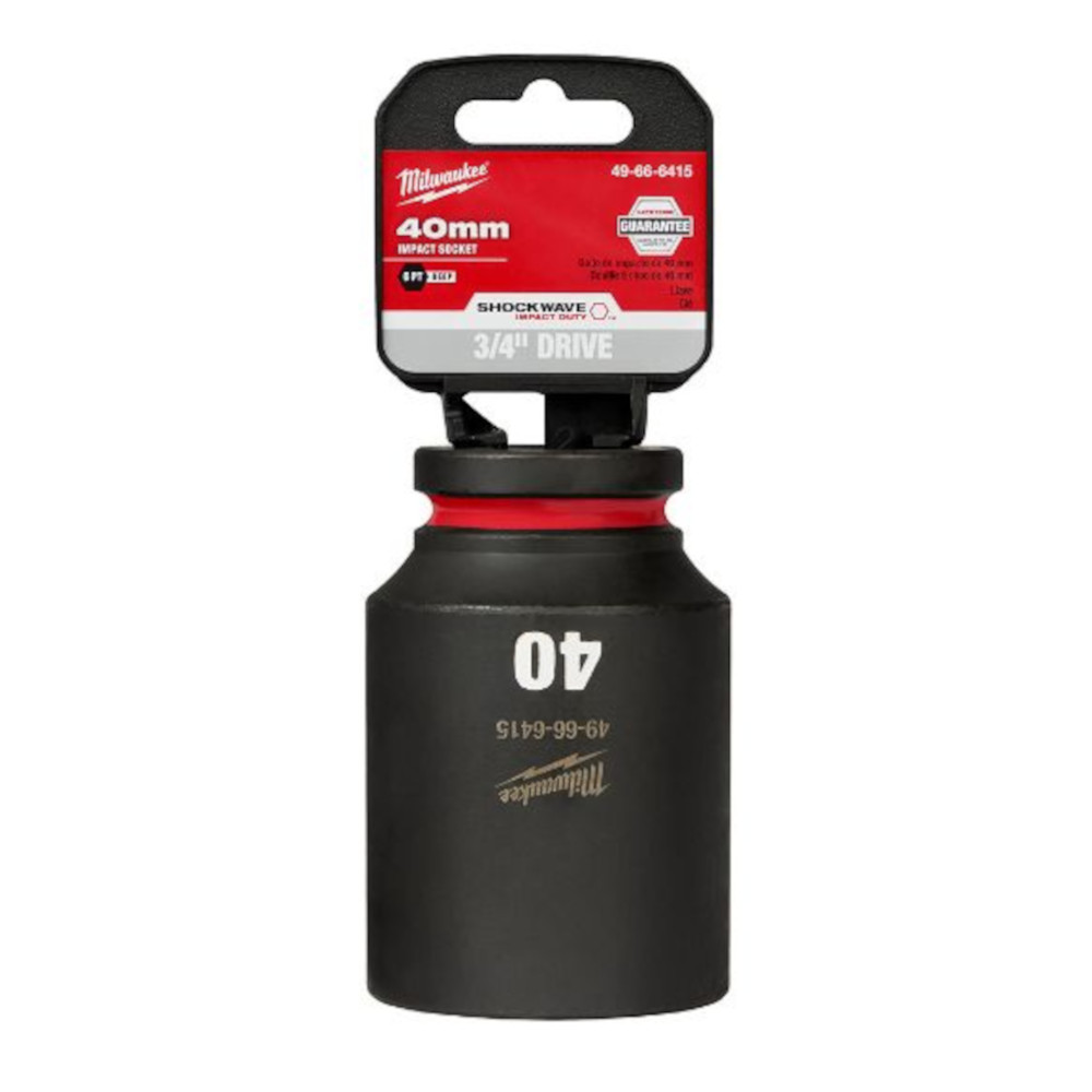 The MILWAUKEE® SHOCKWAVE Impact Duty™ 3/4″ Drive 40MM Deep 6 Point Socket features the boldest, longest-lasting markings and extreme impact durability in high torque applications. The stamped and ink-filled size marking enables an accurate socket selection every time throughout the life of the socket. Engineered with high-strength forged steel for optimized performance in heavy-duty applications, and a non-slip hex geometry prevents fastener rounding. The dual-hole design and ring groove allow for easy socket attachment and removal. All SHOCKWAVE Impact Duty™ Sockets are backed by a Lifetime Guarantee and meet ASME industry standards. Compatible with optional Retaining Ring (49-66-6744).