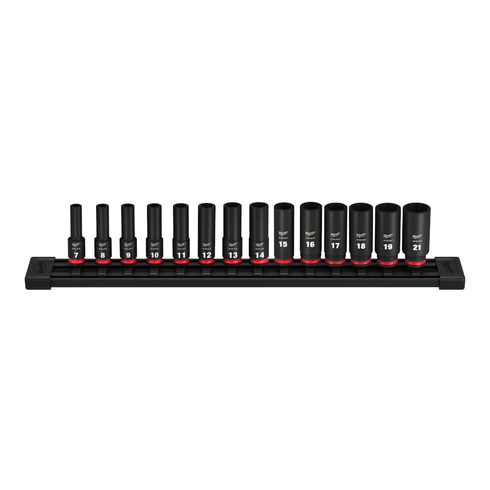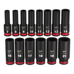 Kit includes 14 Deep Metric Sockets. The following sizes are included: 7, 8, 9, 10, 11, 12, 13, 14, 15, 16, 17, 18, 19, 21
