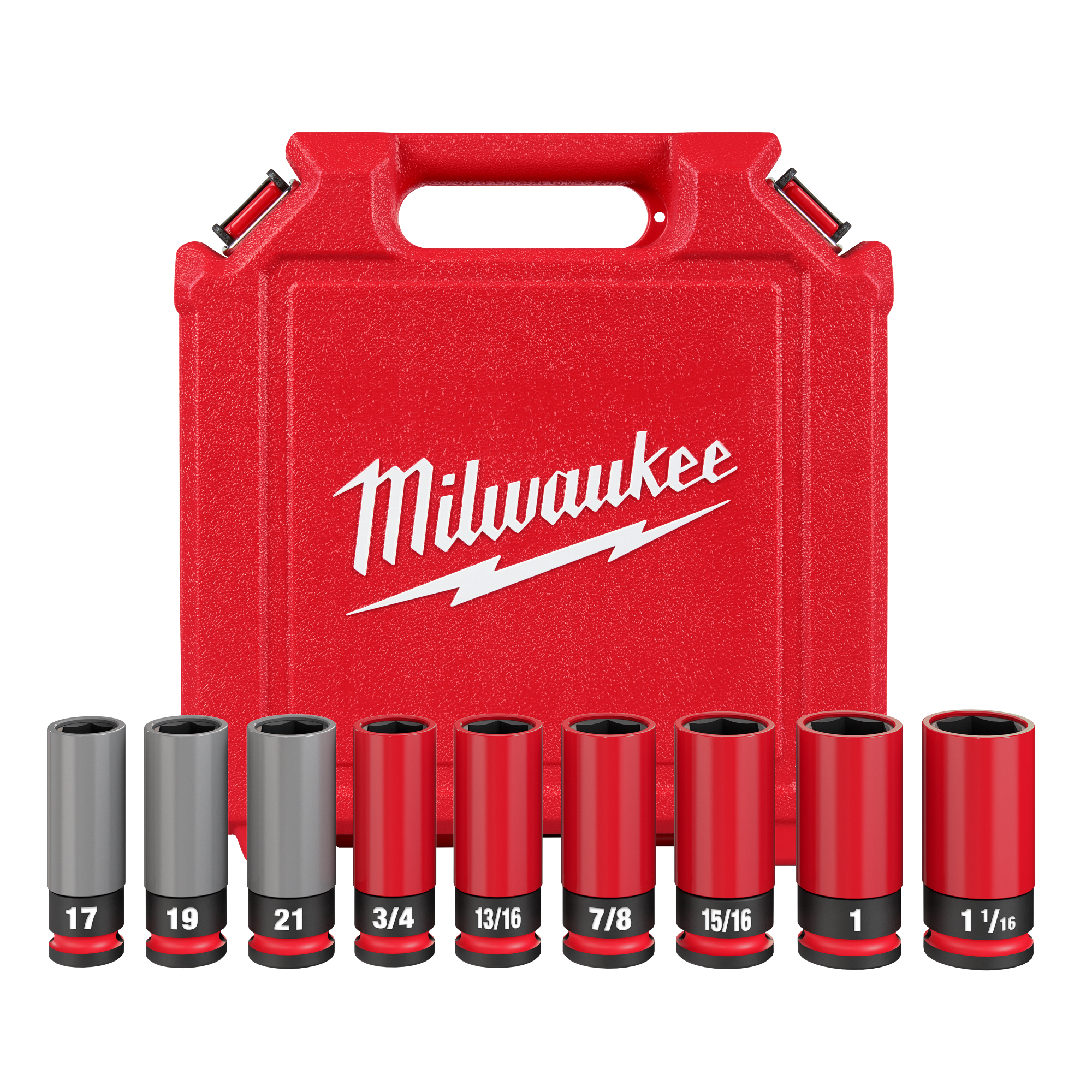MILWAUKEE® SHOCKWAVE Impact Dutyâ„¢ 1/2 Drive 6 Point Lug Nut Wheel Sockets feature the Most Durable, Non-Marring Sleeve to protect rims during tire changes. The ARMOR-GUARDâ„¢ Sleeve is made with premium, durable plastic for Lasting Protection against cracking or shredding during wheel installation and removals. The sockets are thin-walled for easy access in tight wheel assemblies and feature a non-marring plastic insert to protect lug nuts during use. The sleeves are color-coded, Gray for Metric sizes and Red for SAE sizes, to ensure easier socket selection while also featuring stamped & ink filled sizes for the Boldest, Longest Lasting markings. Milwaukee sockets are engineered with high strength forged steel for optimized performance in heavy-duty applications. The customizable Socket Rail comes with removable end caps to add or take off socket clips for optimal storage. The dual-hole design and ring groove allow for easy socket attachment and removal. MILWAUKEE® SHOCKWAVE Impact Dutyâ„¢ Lug Nut Wheel Sockets are optimized for use with 1/2″ drive impact wrenches, drivers, ratchets, and adapters and meet ASME industry standards for thin-walled sockets.