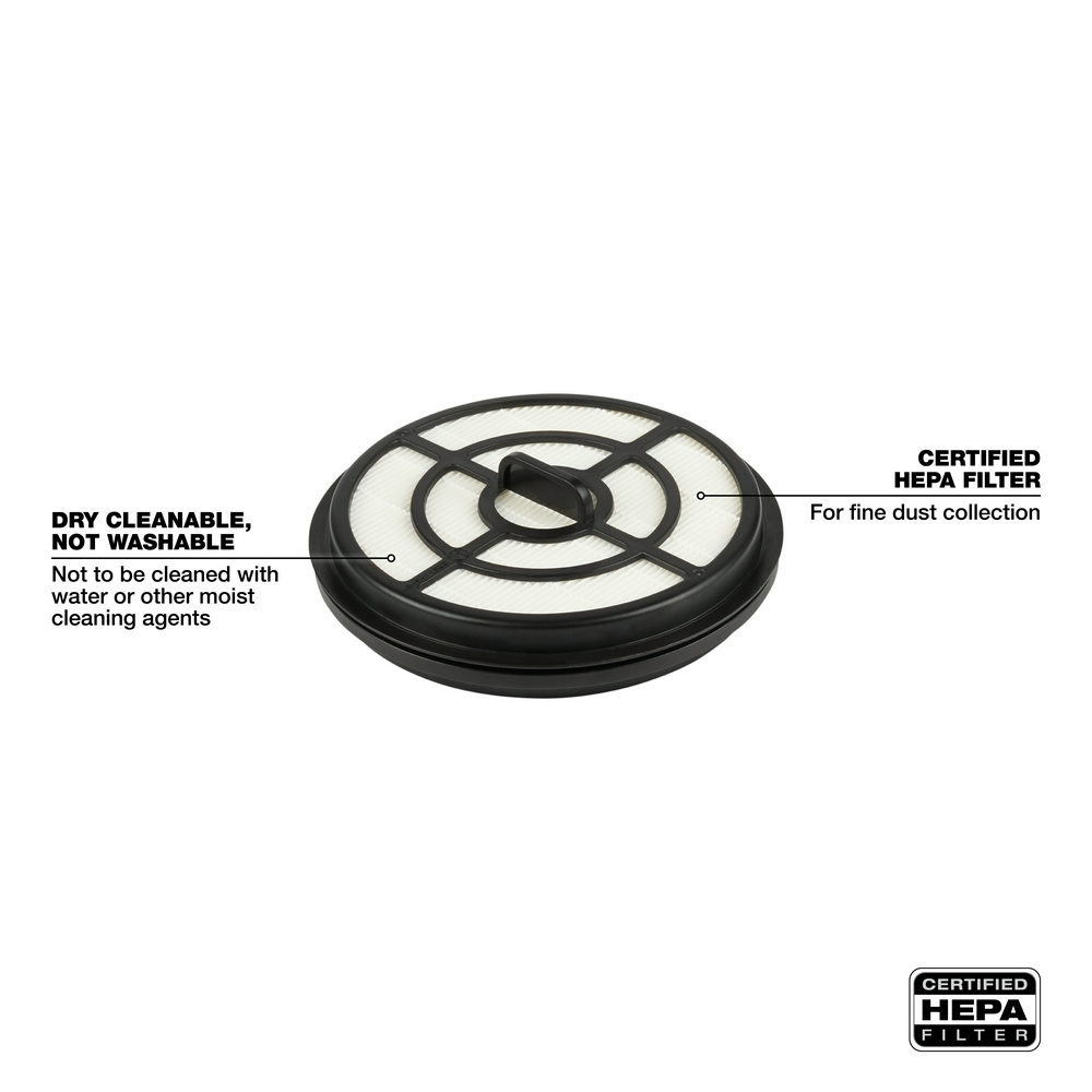 The MILWAUKEE HEPA Filter works on the M18 FUEL 3-in-1 Backpack Vacuum. The HEPA filter is easy to install and captures 99.97% of all particles greater than 0.3 microns for fine dust collection. This product contains one HEPA Filter.