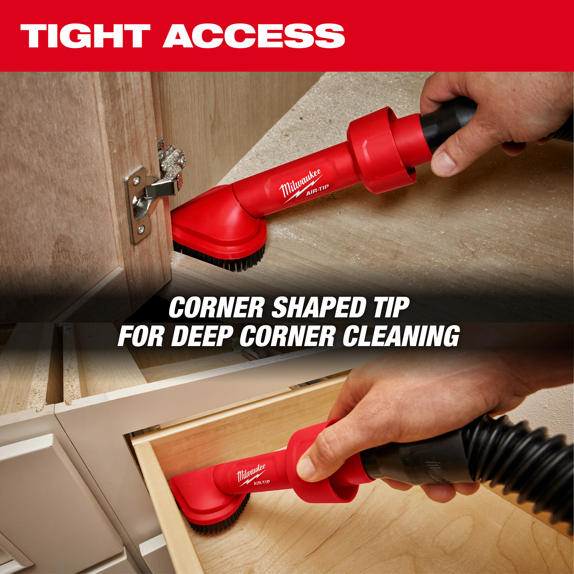 The MILWAUKEE® AIR-TIP™ Rotating Corner Brush Tool easily goes into corners with its spade-shaped tip for deep corner cleaning. The agitating brushes on the tip easily remove debris in stubborn corners. The 360-degree rotating brush head enhances the cleaning experience when pushing or pulling in challenging areas like elevated inside corners. The AIR-TIP™ Rotating Corner Brush Tool is compatible with other wet/dry vacuum brands that include 1-1/4”, 1-7/8”, 2-1/2” diameters, and is part of the AIR-TIP™ family of Trade Focused Vacuum Accessories.