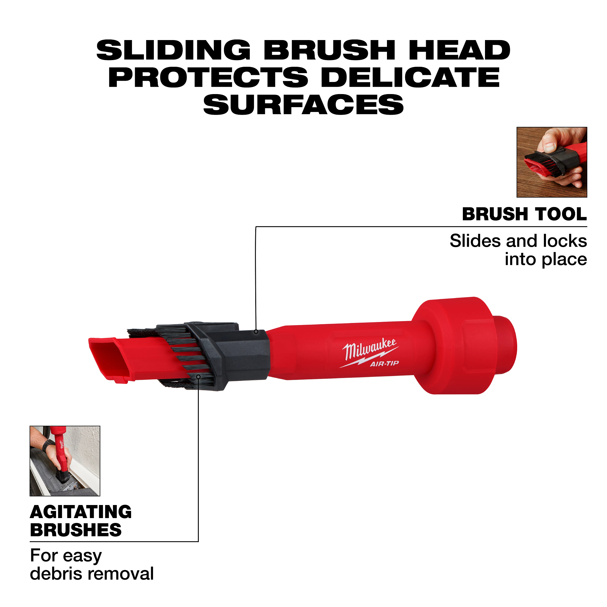The MILWAUKEE® AIR-TIP™ 2-in-1 Utility Brush Tool can clean multiple surfaces with easy access sliding brush. The sliding brush can be easily deployed with a click of a button to protect delicate surfaces or agitate debris when needed. Sliding back the brush head allows for additional cleaning versatility when more suction is needed or bristles are not. The AIR-TIP™ 2-in-1 Utility Brush Tool is compatible with other wet/dry vacuum brands with 1-1/4”, 1-7/8”, 2-1/2” diameters, and is part of the AIR-TIP™ family of Trade Focused Vacuum Accessories.