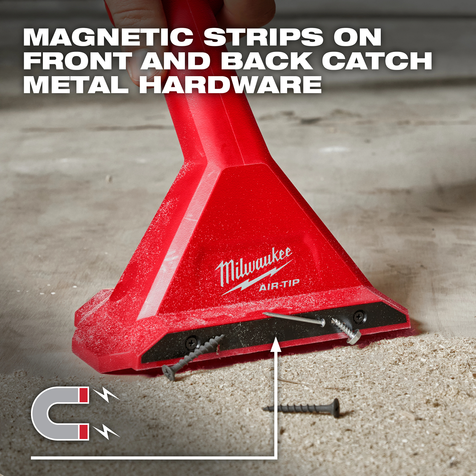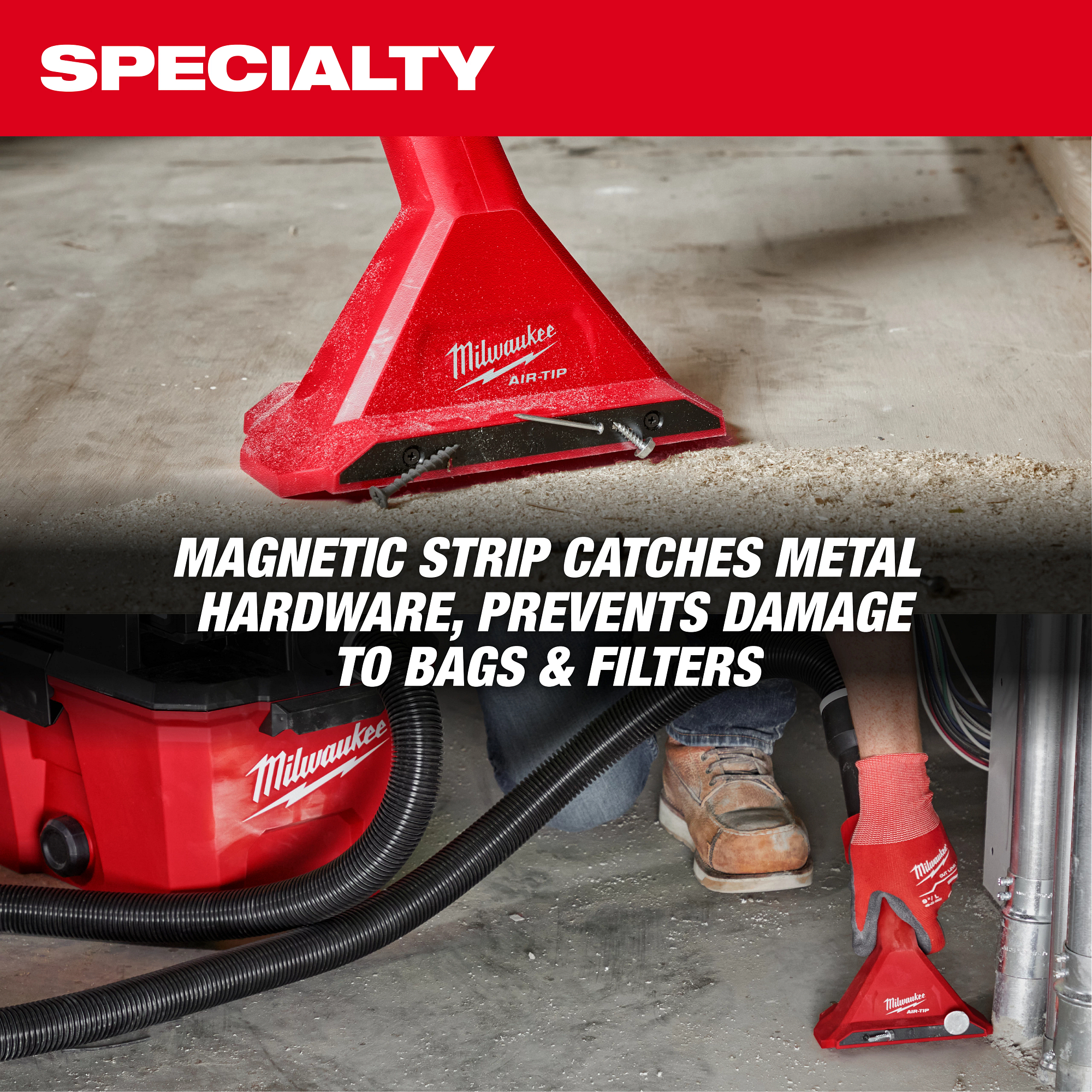 The MILWAUKEE® AIR-TIP™ Magnetic Utility Nozzle has integrated magnets that catch metal hardware, preventing damage to bags and filters inside of a wet/dry vacuum. The magnetic strips are located on the front and back of the vacuum tool to catch metal hardware before it gets inside the vacuum. The black zinc coating on the magnets prevents rust long-term. The AIR-TIP™ Magnetic Utility Nozzle is compatible with other wet/dry vacuum brands with 1-1/4”, 1-7/8”, 2-1/2” diameters, and is part of the AIR-TIP™ family of Trade Focused Vacuum Accessories.